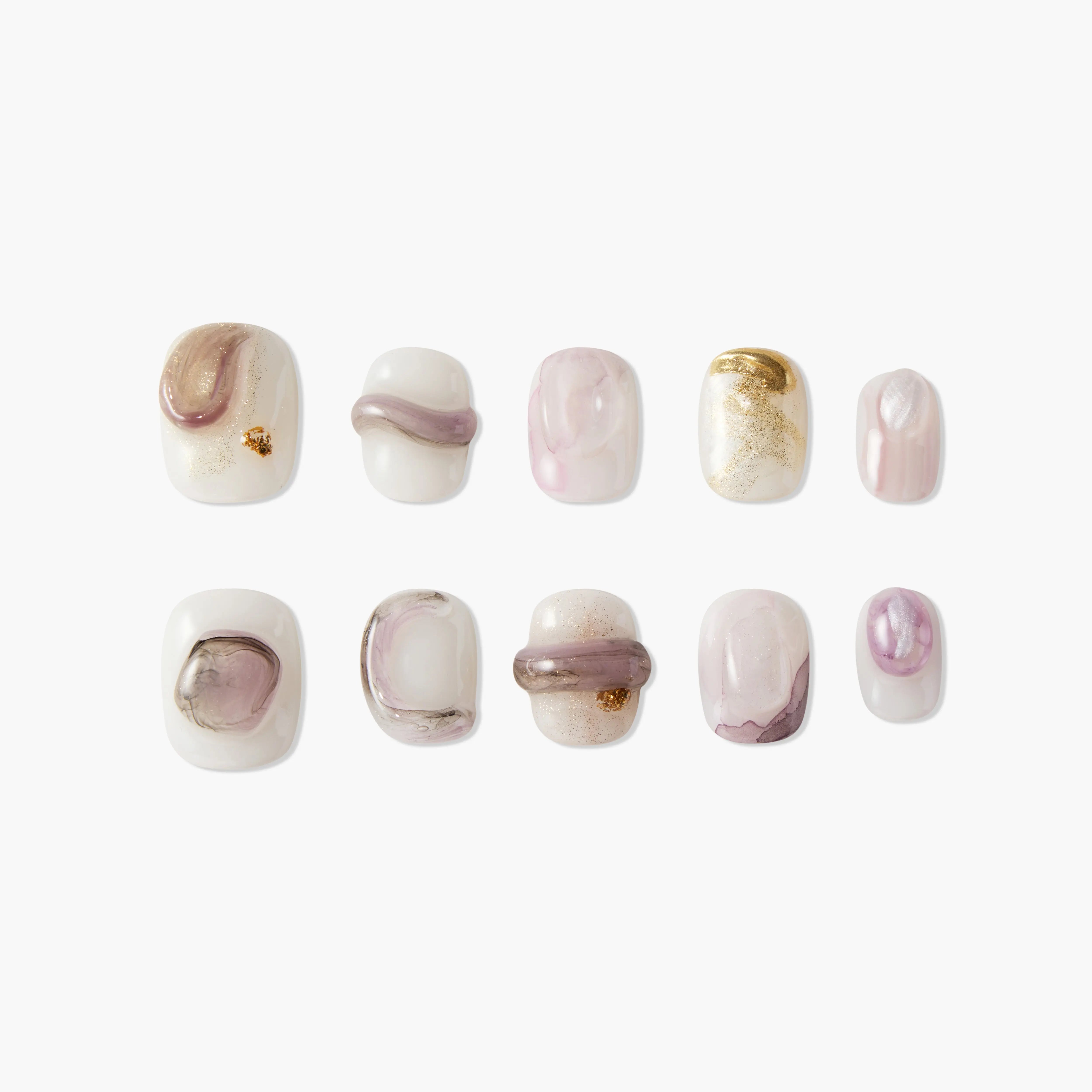 Lavender Mist apresenta uma base branca suave infundida com redemoinhos fluidos de lavanda e taupe, acentuados por toques de brilho dourado e texturas 3D delicadas. O design orgânico e fluido evoca uma sensação de calma e sofisticação, tornando-o perfeito tanto para uso diário como para ocasiões formais. Este conjunto de unhas é uma forma elegante de adicionar um toque artístico subtil ao seu visual.
