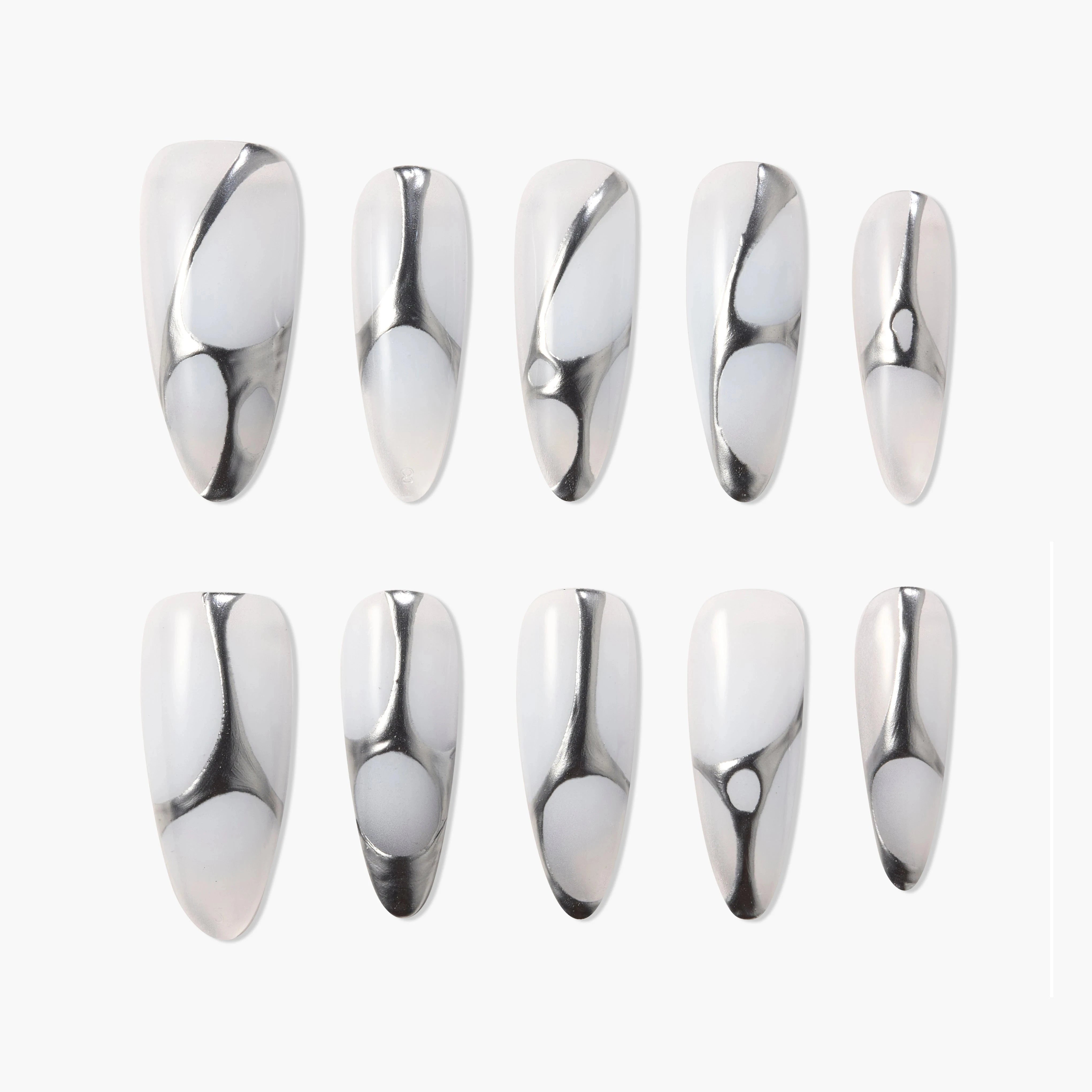 Uma visão de elegância futurista — o Liquid Chrome Flow da Emily funde tons suaves de branco com linhas de prata fundida, criando um efeito escultórico de metal líquido. Elegante, minimalista e poderoso, este design reflete a luz como arte em cromo — uma peça de destaque para quem ousa brilhar com confiança moderna.