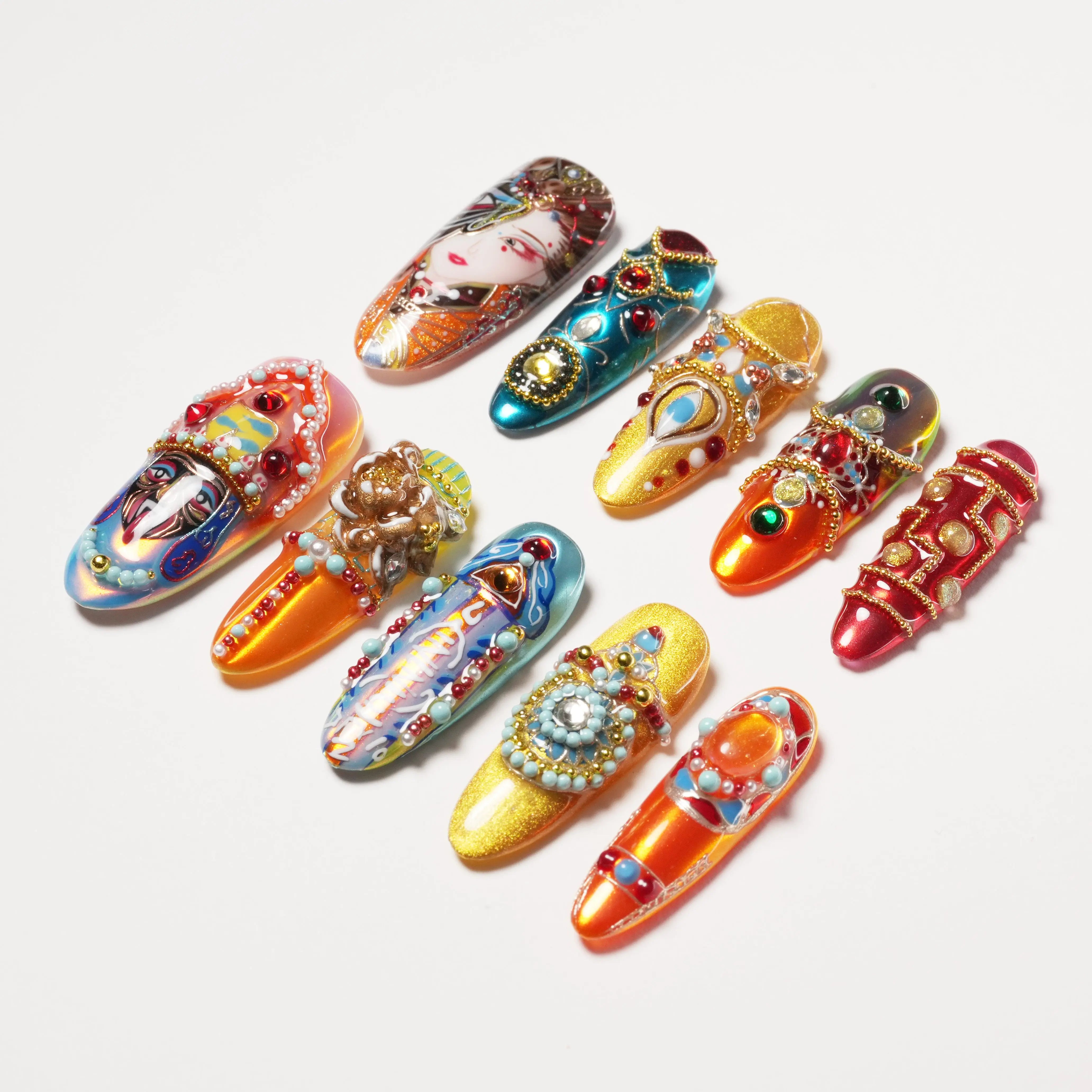 As unhas autocolantes "Mask of Mystery" apresentam cores vibrantes e decorações intrincadas com pedras preciosas, com cada unha exibindo máscaras únicas ou padrões místicos. A combinação de pedras brilhantes e detalhes metálicos traz uma vibração cultural profunda e misteriosa. Os desenhos artísticos coloridos e os detalhes delicados tornam esta coleção cheia de charme exótico e sofisticação, como se entrássemos num mundo de arte mística. Perfeito para quem procura uma expressão artística única e individualidade, combinando moda com tradição.