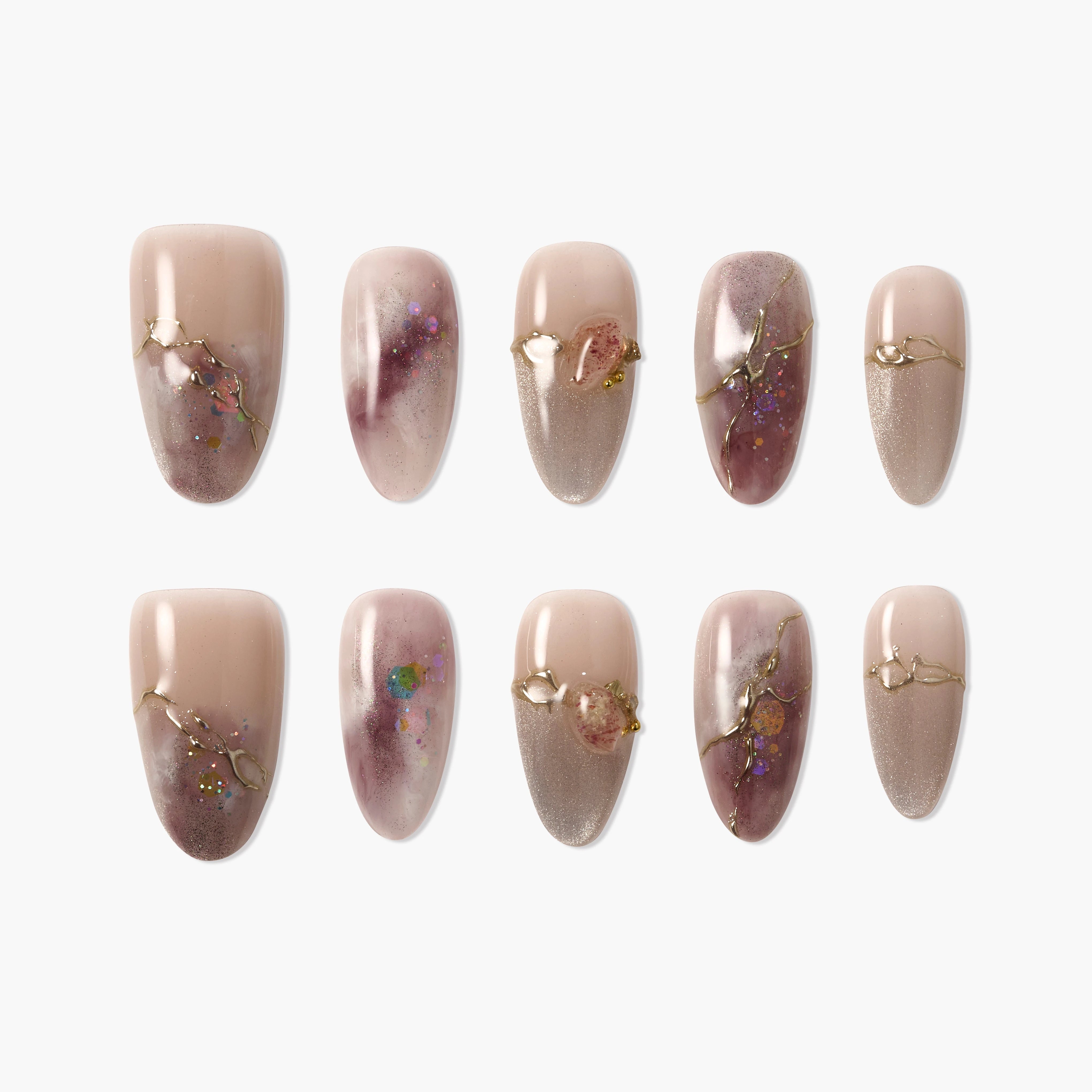 Mauve Vein Glow combina tons suaves nude com gradientes translúcidos de malva e flocos iridescentes dispersos. Linhas orgânicas de veias douradas fluem pelo design como texturas de pedra natural, adicionando profundidade e elegância subtil. O brilho suave e as transições fluidas de cor criam um aspeto calmo e refinado com um acabamento artístico moderno.