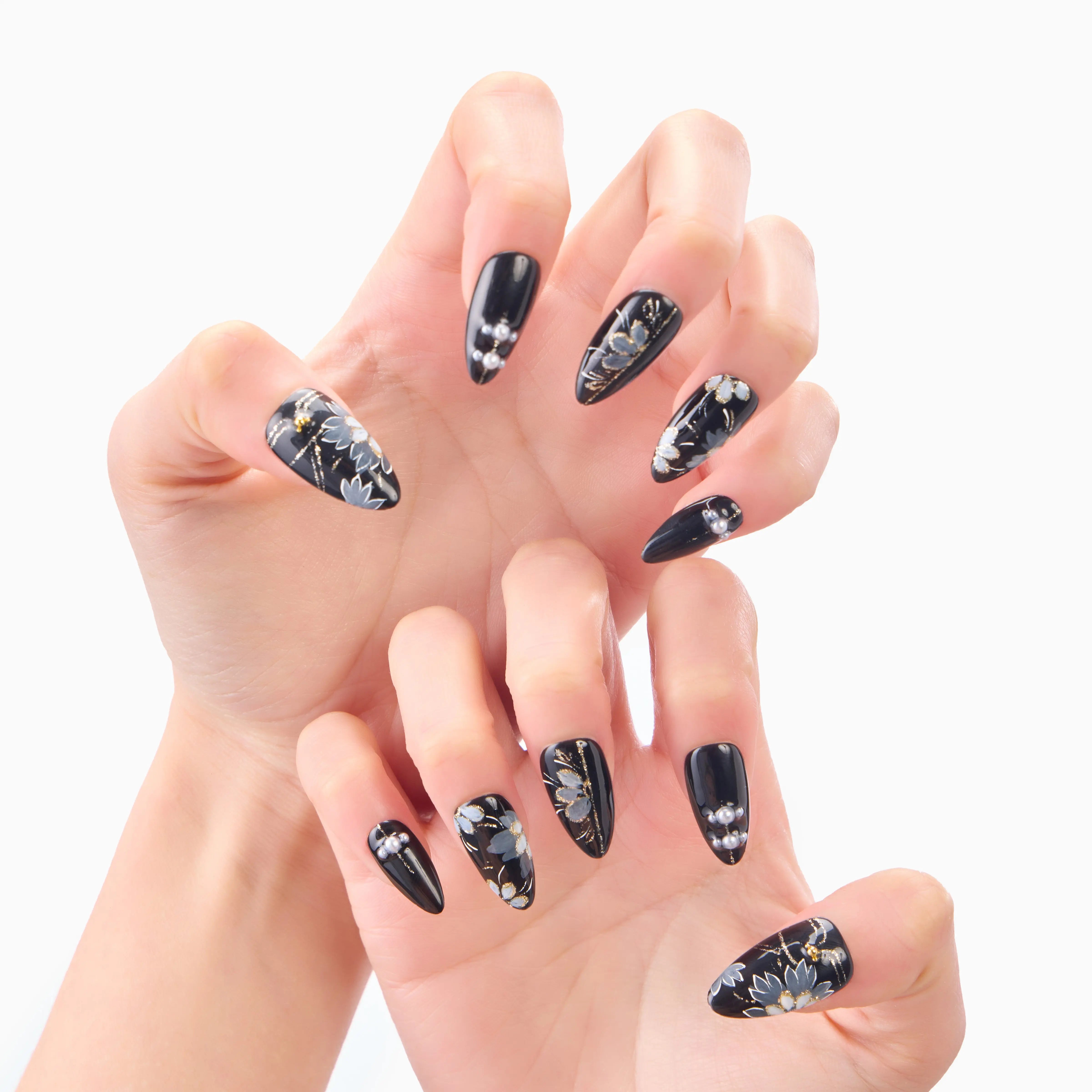 Midnight Blooms série de unhas apresenta uma base preta profunda com padrões florais azuis intrincados e acentos dourados, evocando uma sensação de mistério e elegância. Cada unha é adornada com flores pintadas à mão e pérolas cintilantes, adicionando um toque de romance e sofisticação. O design geral captura o encanto misterioso da noite, perfeito para quem aprecia luxo discreto e beleza única.