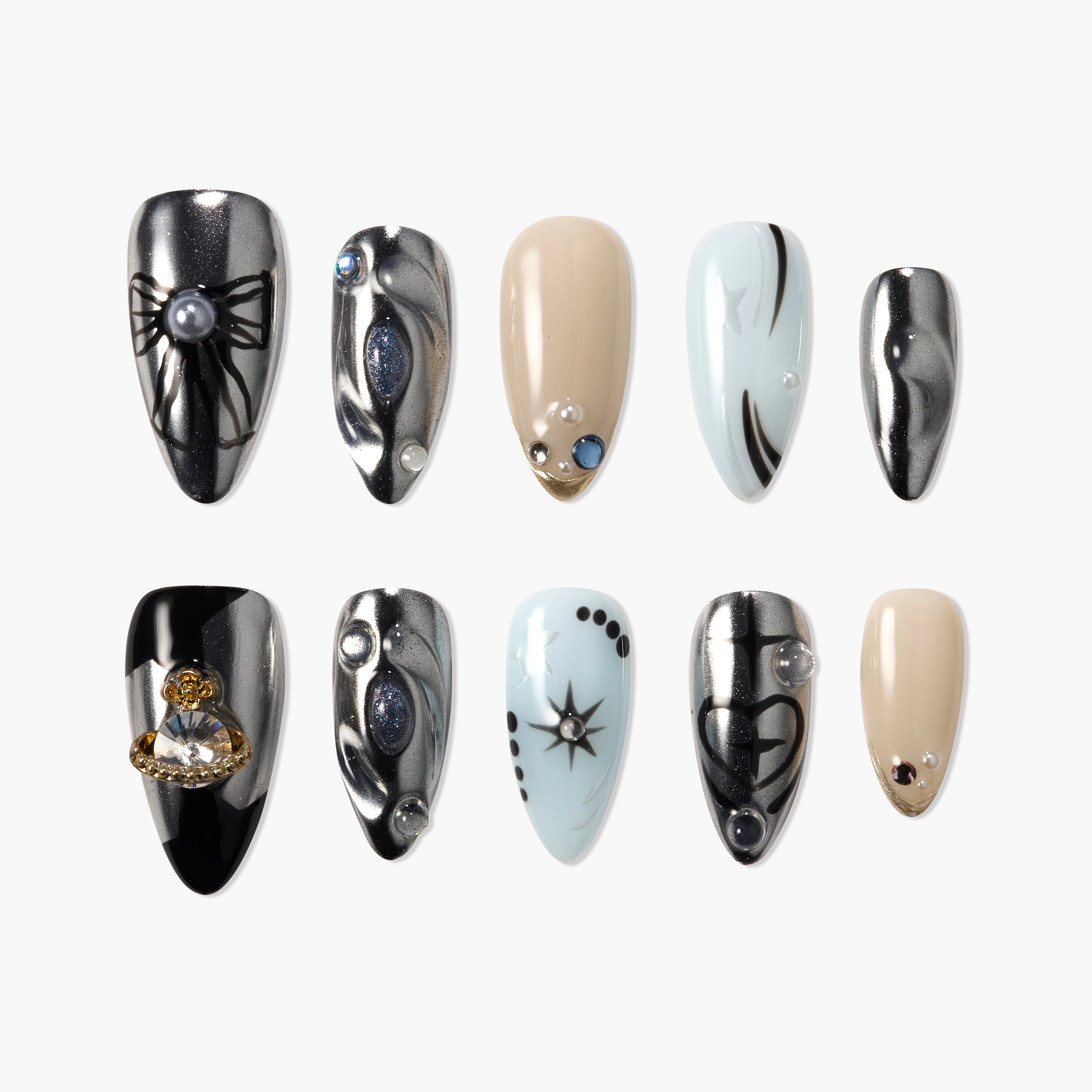 Midnight Orbit combina cromo metálico, bege suave e azul gelado num conjunto futurista inspirado no celestial. Linhas de fita preta, texturas de metal líquido, motivos de estrelas e detalhes em pedras preciosas criam um visual cósmico arrojado e elegante. Perfeito para quem adora designs vanguardistas e ousados com um toque de mistério.