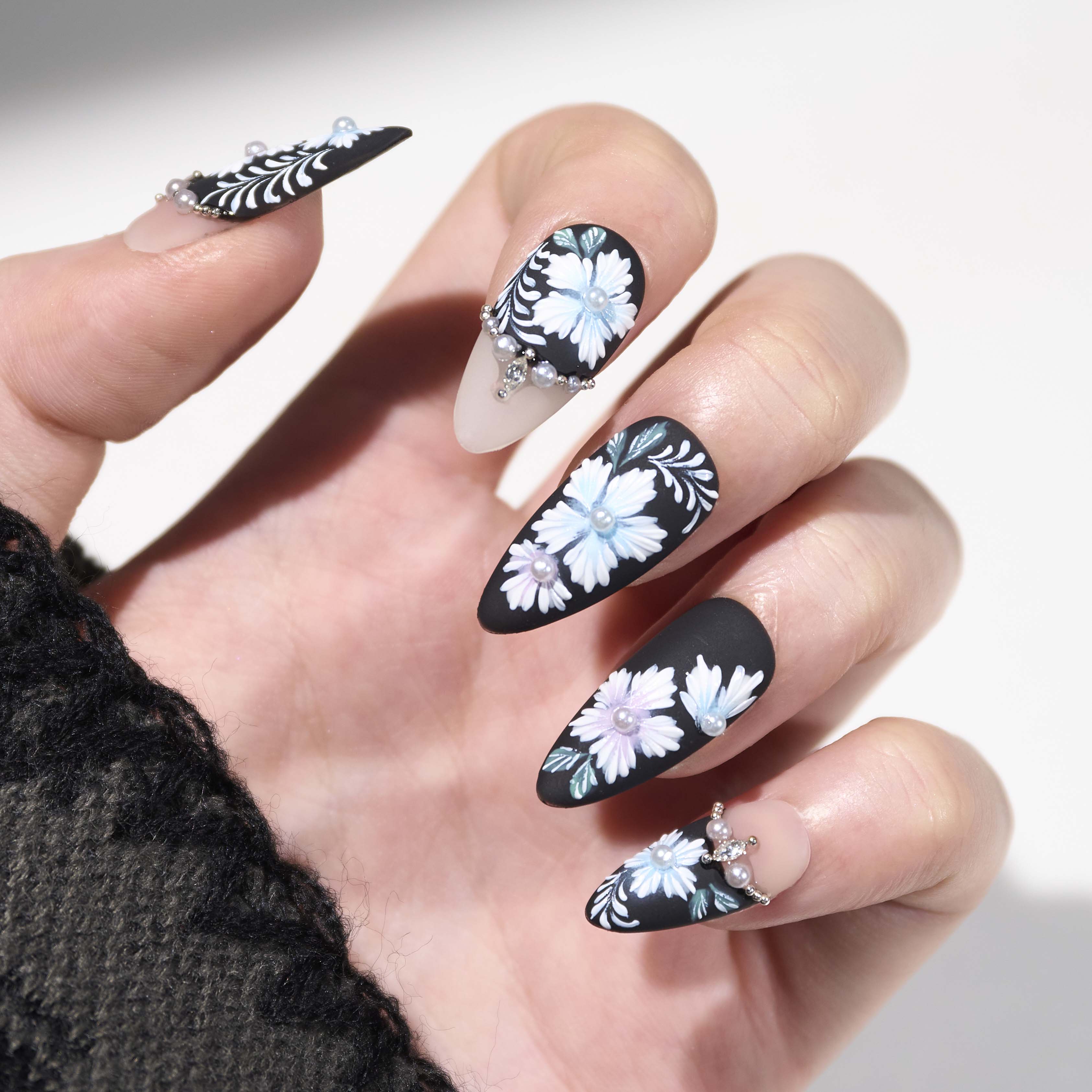Entre no mistério e na elegância com o Noir Garden da Emily. Flores 3D pintadas à mão desabrocham contra um fundo preto mate, realçadas com pérolas e pedras metálicas para um toque de opulência. Cada pétala e folha é esculpida com precisão, criando um contraste marcante entre suavidade e força. Perfeito para roupas de noite, galas ou para quem adora sofisticação artística.