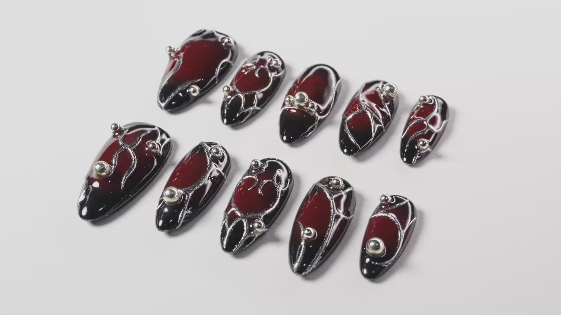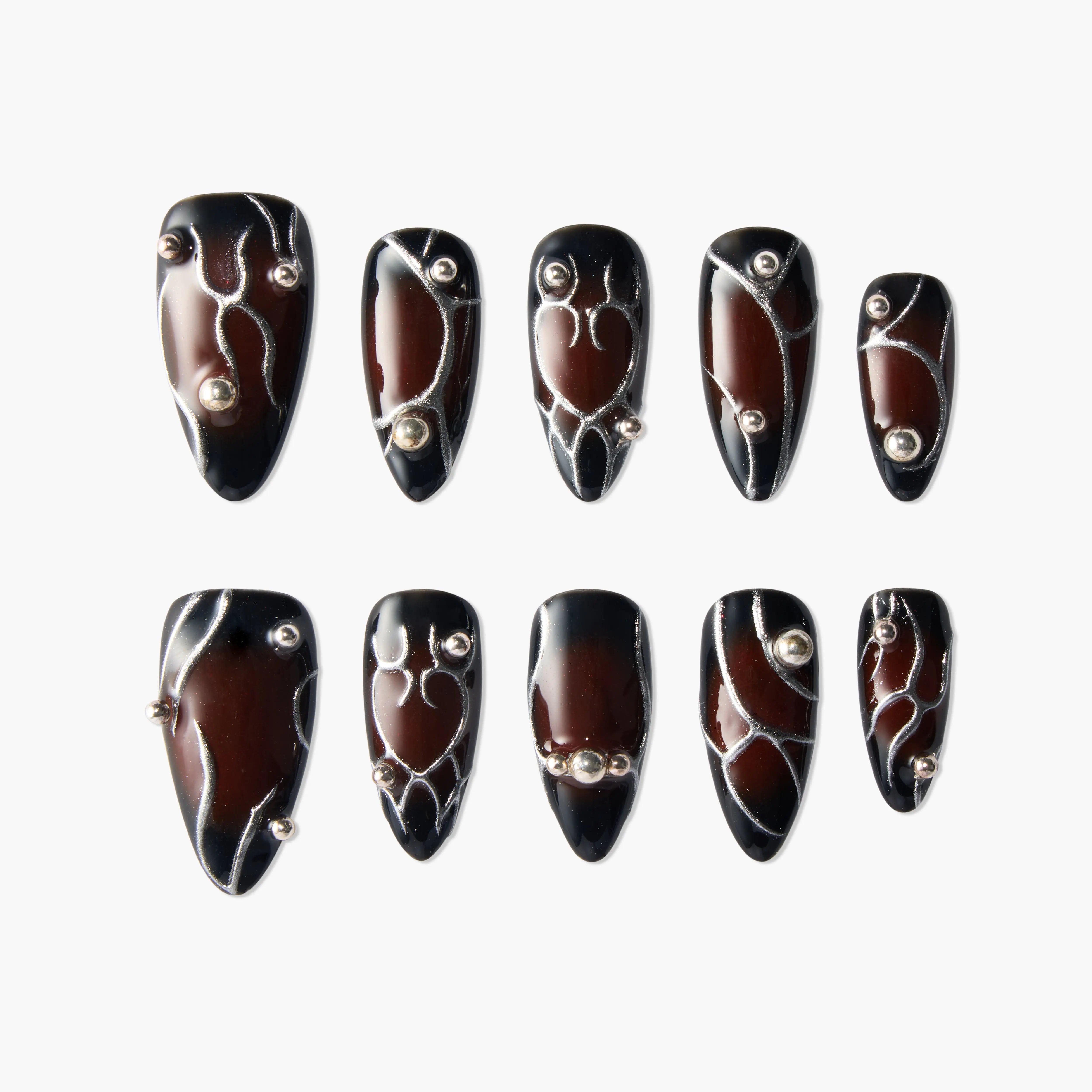 Obsidian Phantom apresenta uma base preta profunda com padrões intrincados em forma de veias prateadas e tachas metálicas, criando um charme ousado e misterioso. A textura fluida imita o brilho da obsidiana, adicionando profundidade e mistério. Perfeito para quem dita tendências, looks inspirados no rock e estilos prontos para festas que exalam confiança e atitude.