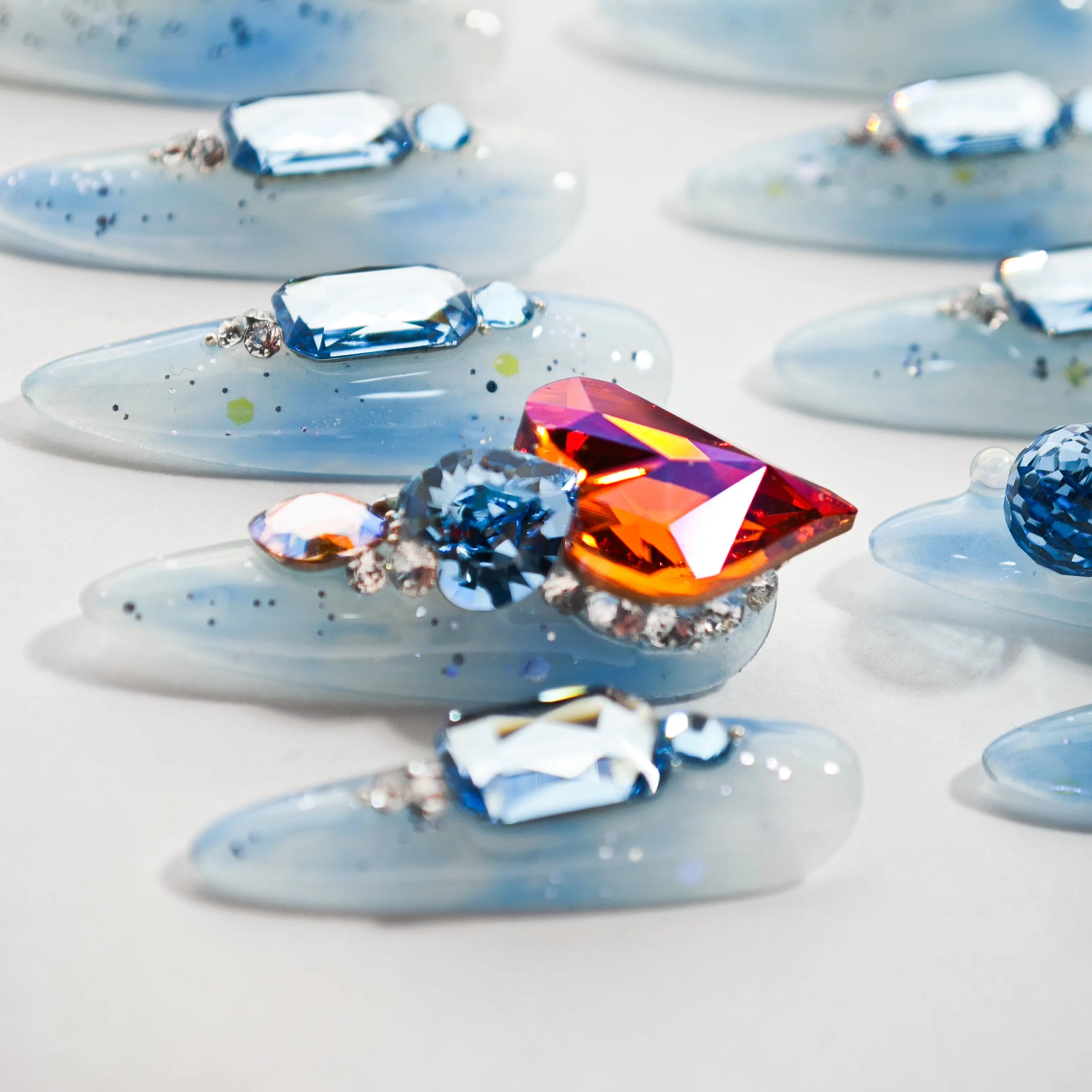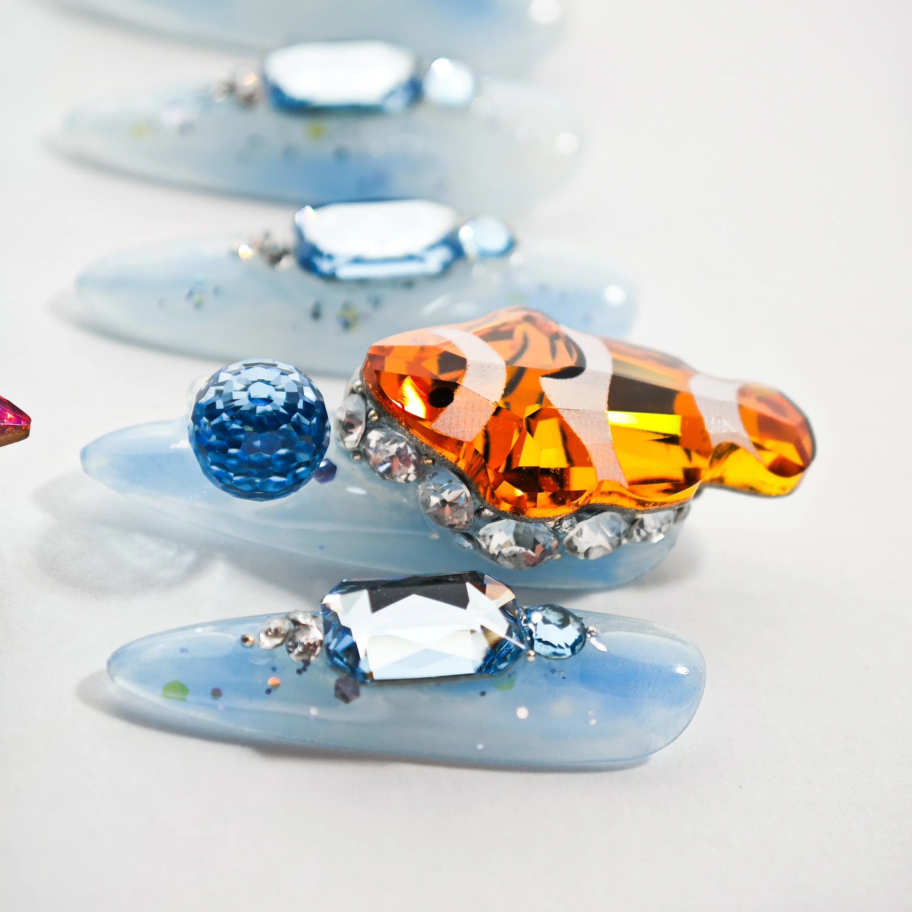 Descubra as unhas autocolantes Oceanic Gemstones da Emily’s Nail, com deslumbrantes pedras azuis e laranja para um design vibrante inspirado no mar.