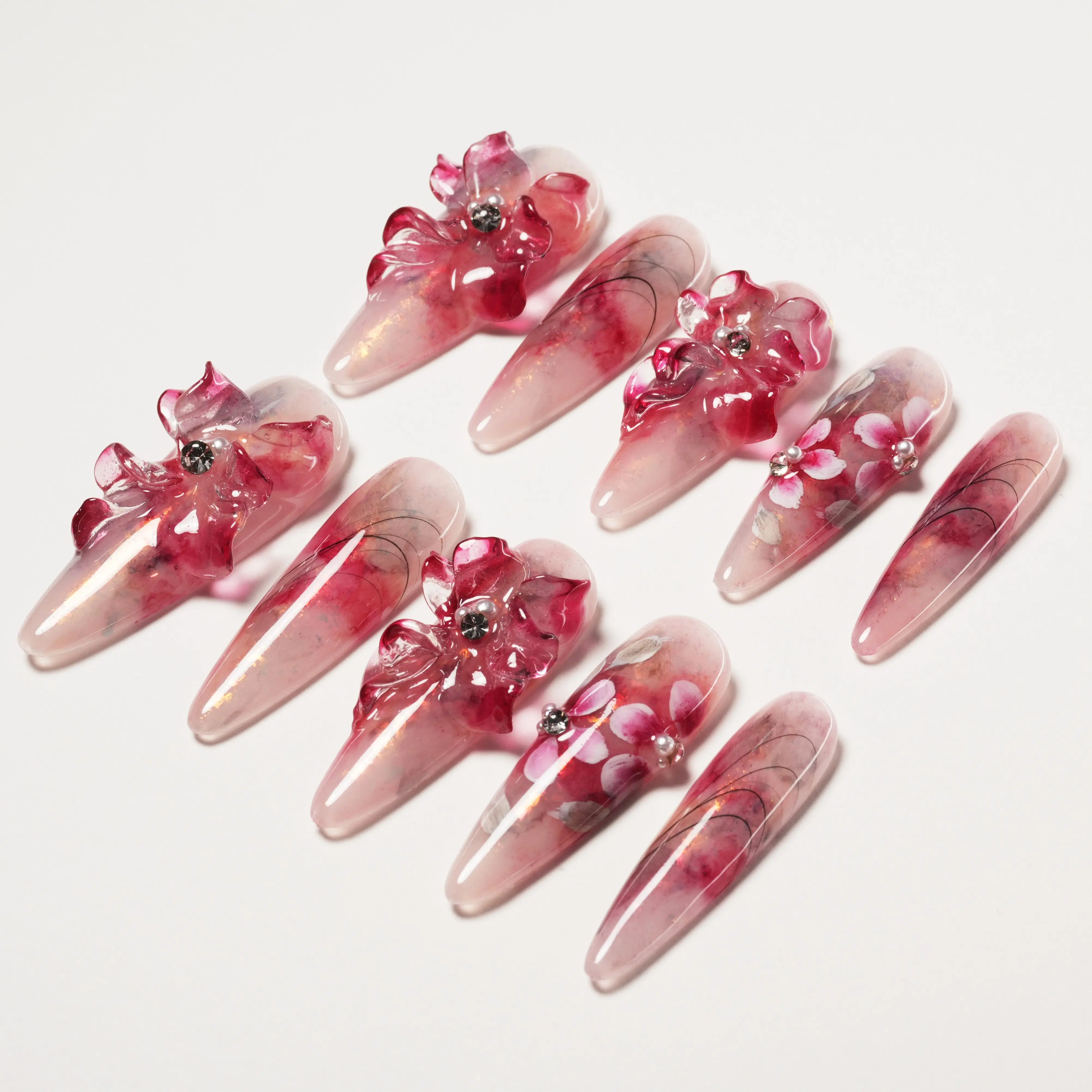As unhas postiças "Peach Blossom Embrace" apresentam uma base rosa suave, adornada com delicados padrões de flor de pêssego e enfeites florais tridimensionais, exalando romance e elegância. O gradiente subtil e as pétalas finas em cada unha assemelham-se às flores de pêssego em flor na primavera. Os detalhes em pérola e cristal realçam a sensação luxuosa do design. Perfeito para quem procura um estilo suave e refinado, este design incorpora doçura e romance.