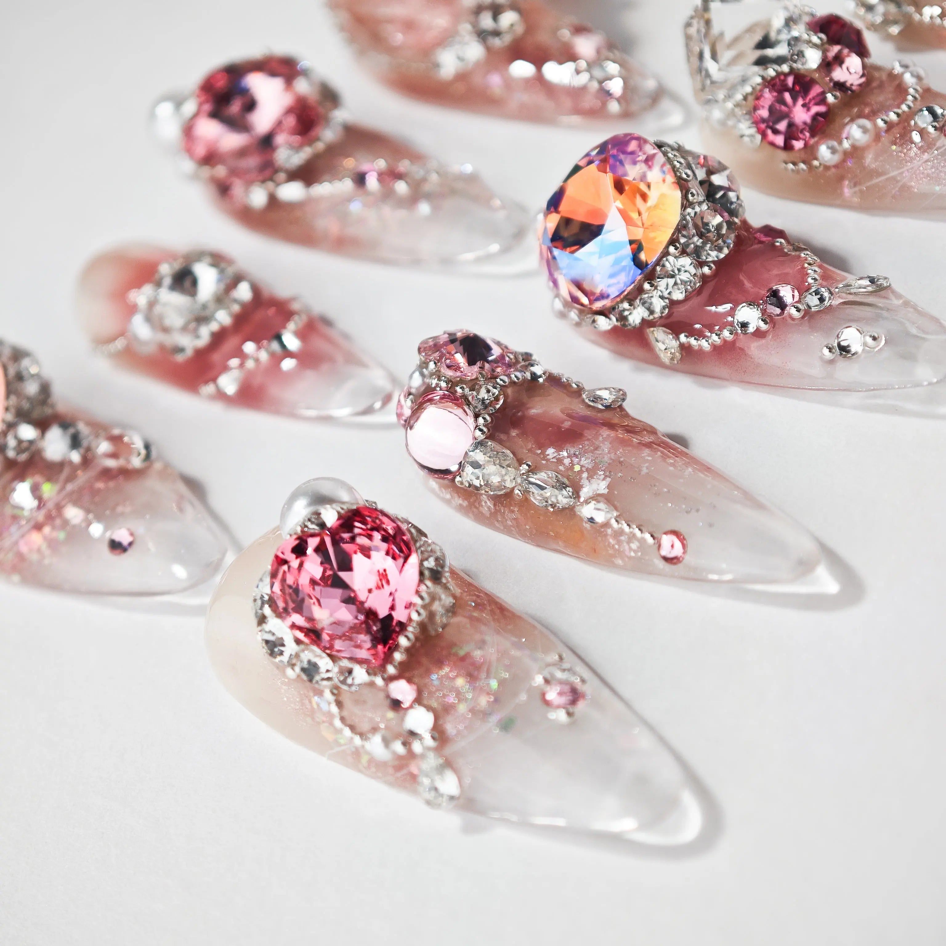 Explore as unhas de pressão Pink Crystal Elegance da Emily’s Nail, com deslumbrantes cristais cor-de-rosa e delicados adornos para um visual glamoroso e sofisticado.