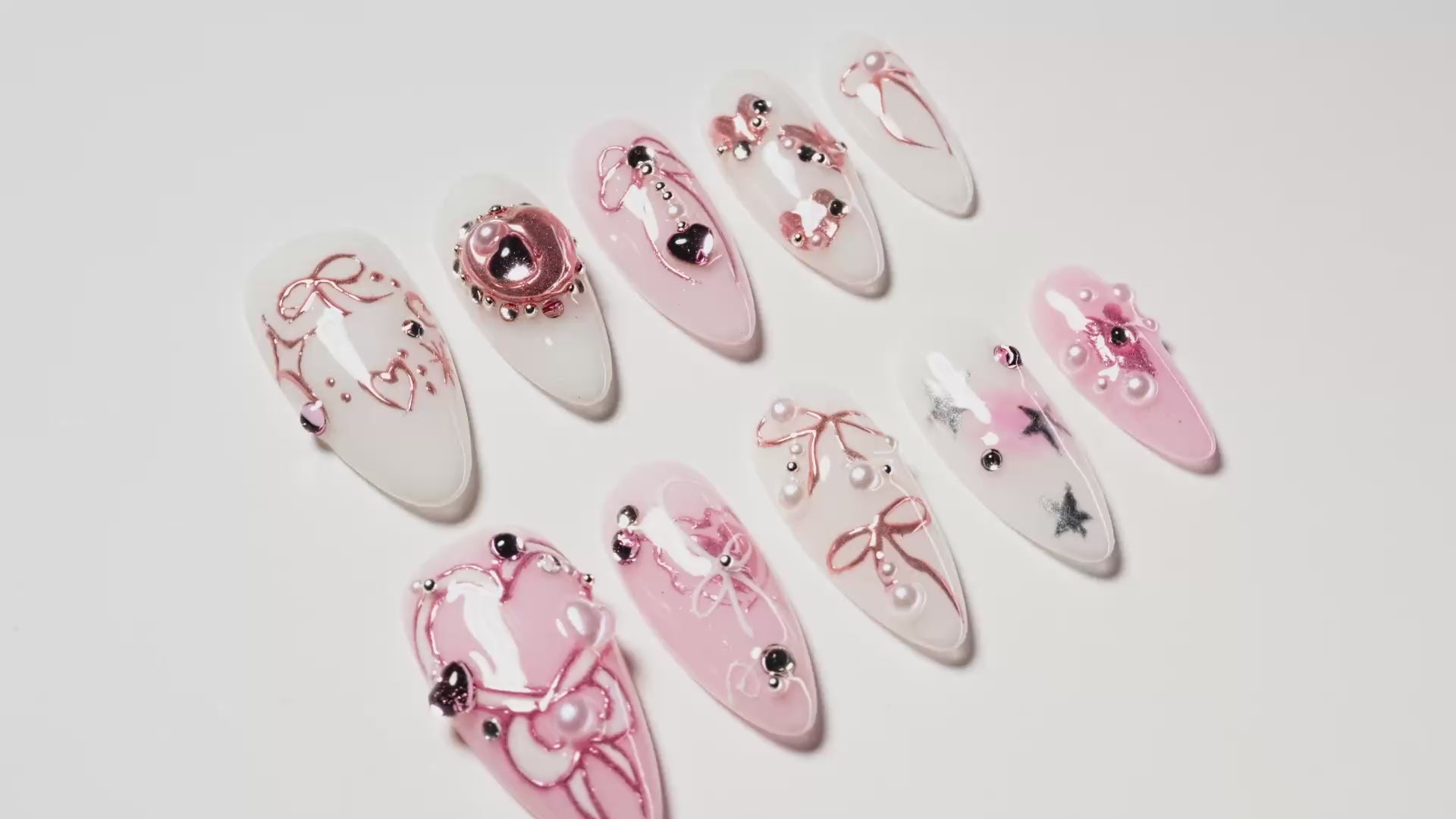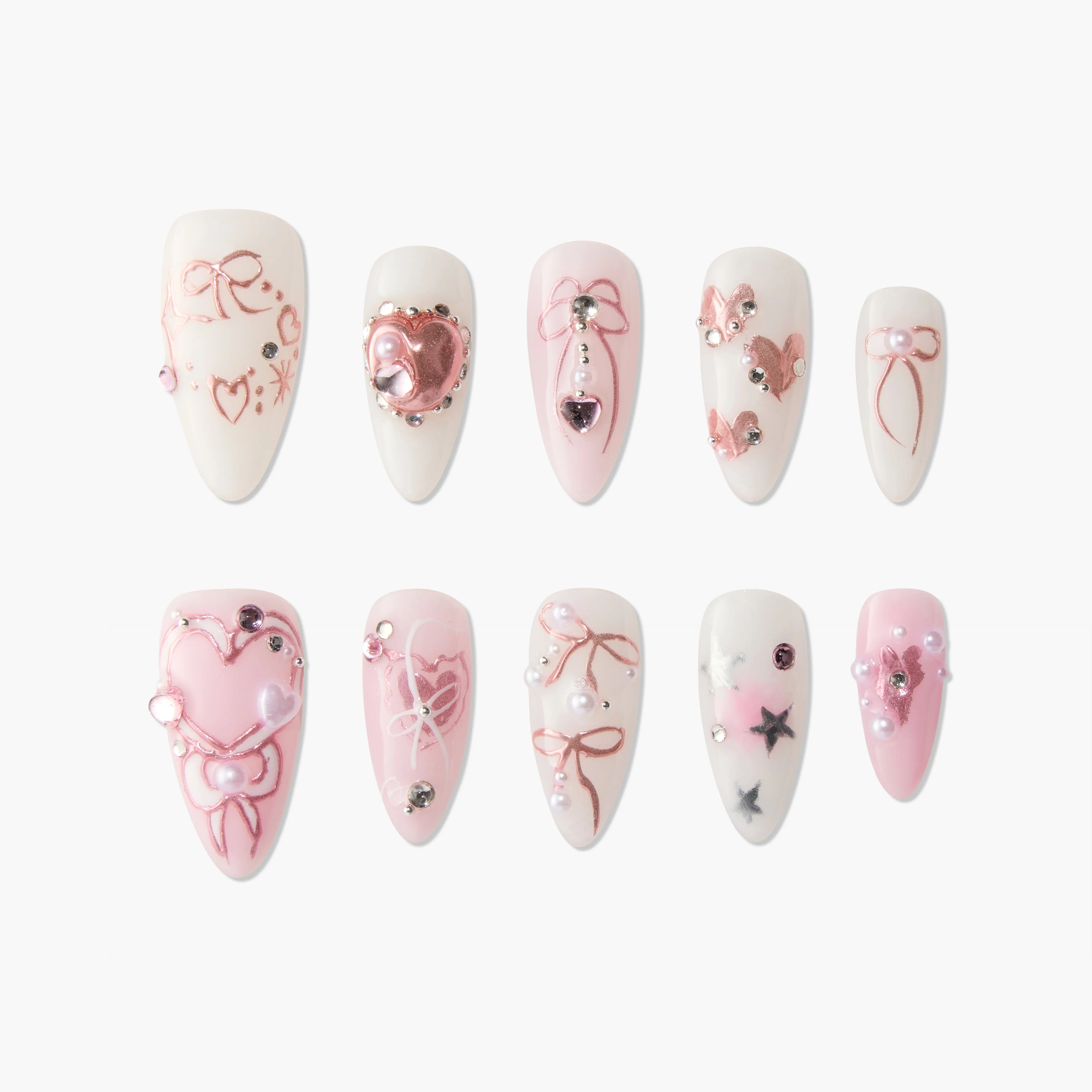 As unhas reutilizáveis Pink Heart Bow apresentam belos designs de laço, coração e estrela, adornados com pérolas delicadas e cristais brilhantes, exalando uma vibração romântica e doce. Reutilizáveis para conveniência, perfeitas para qualquer ocasião doce, adicionando um charme de sonho às suas pontas dos dedos.