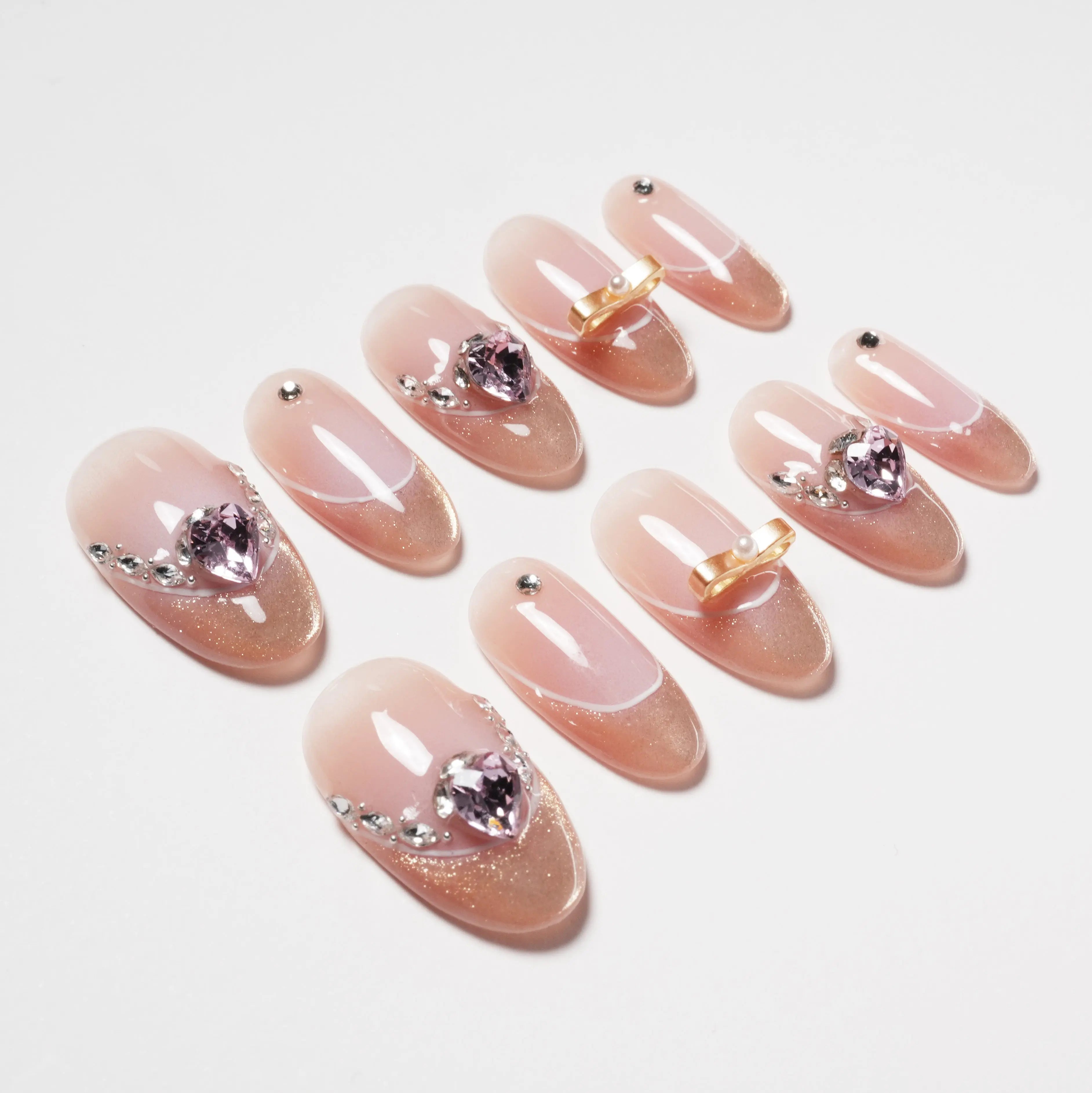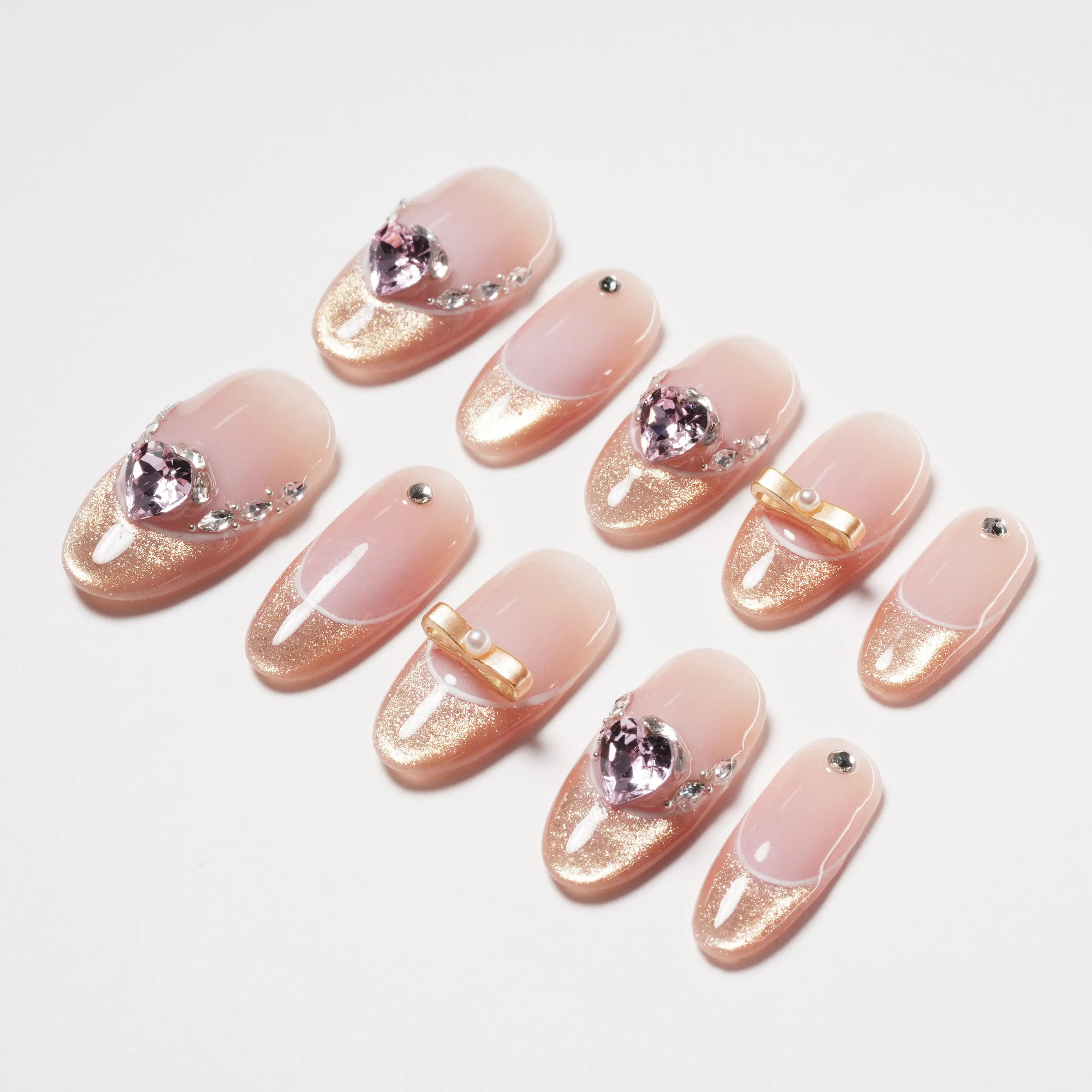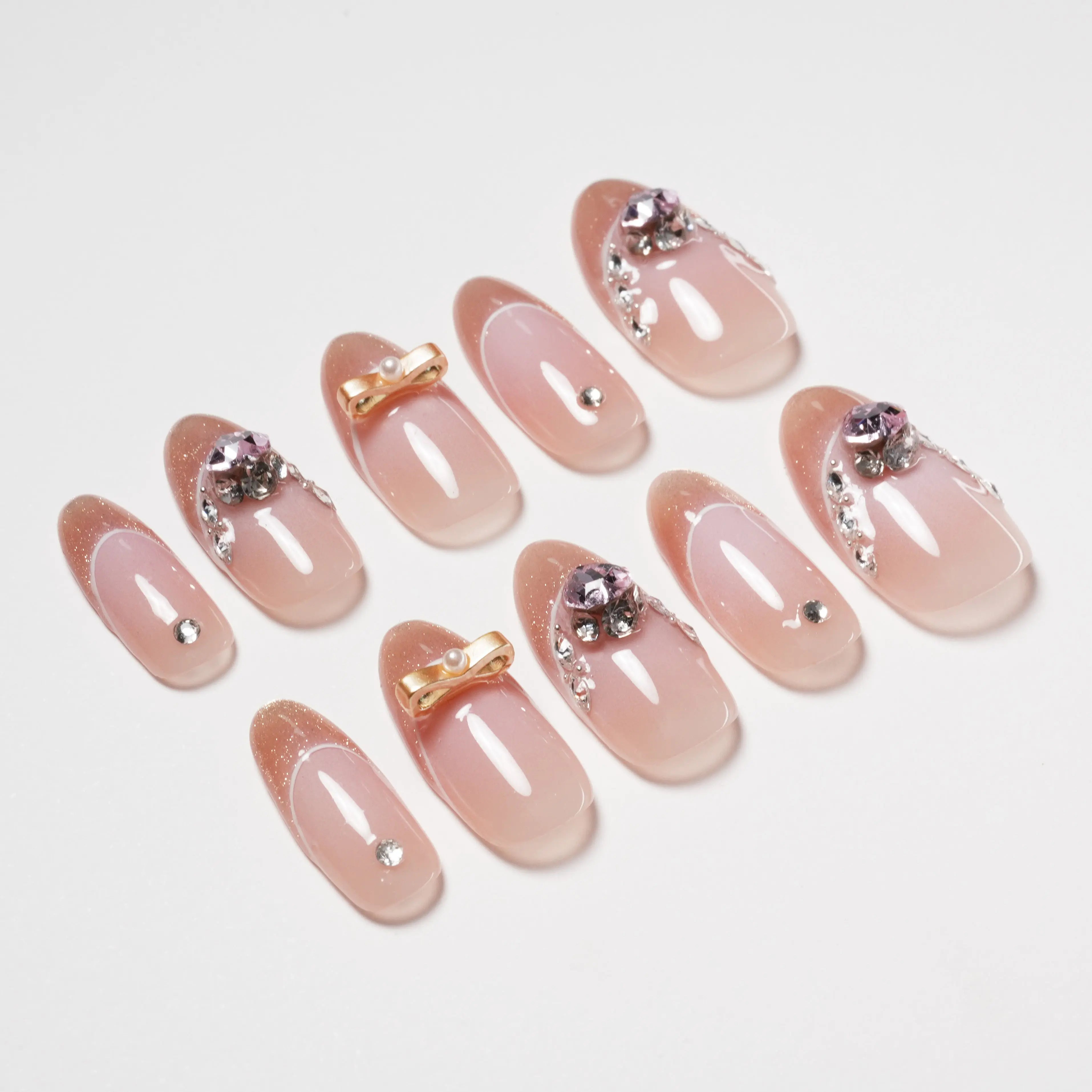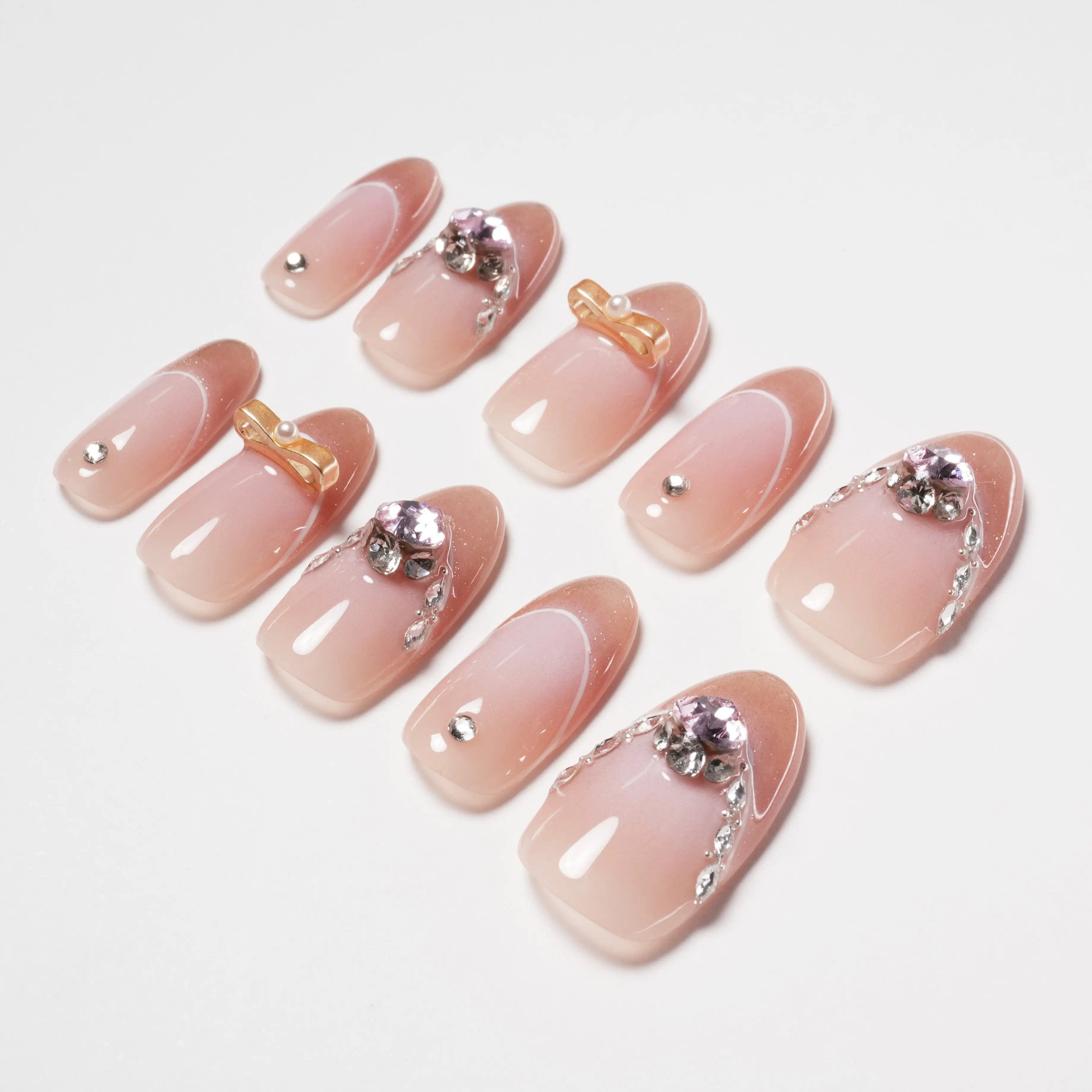 As unhas postiças "Precious Glow" apresentam uma base em gradiente nude suave, adornada com cristais deslumbrantes e laços dourados requintados, combinando nobreza e elegância de forma harmoniosa. O design único dos cristais e dos detalhes em pérola cria um efeito visual delicado e romântico, como se joias preciosas estivessem a beijar as pontas dos seus dedos. Perfeitas para qualquer ocasião, exibindo luxo refinado e sofisticação.