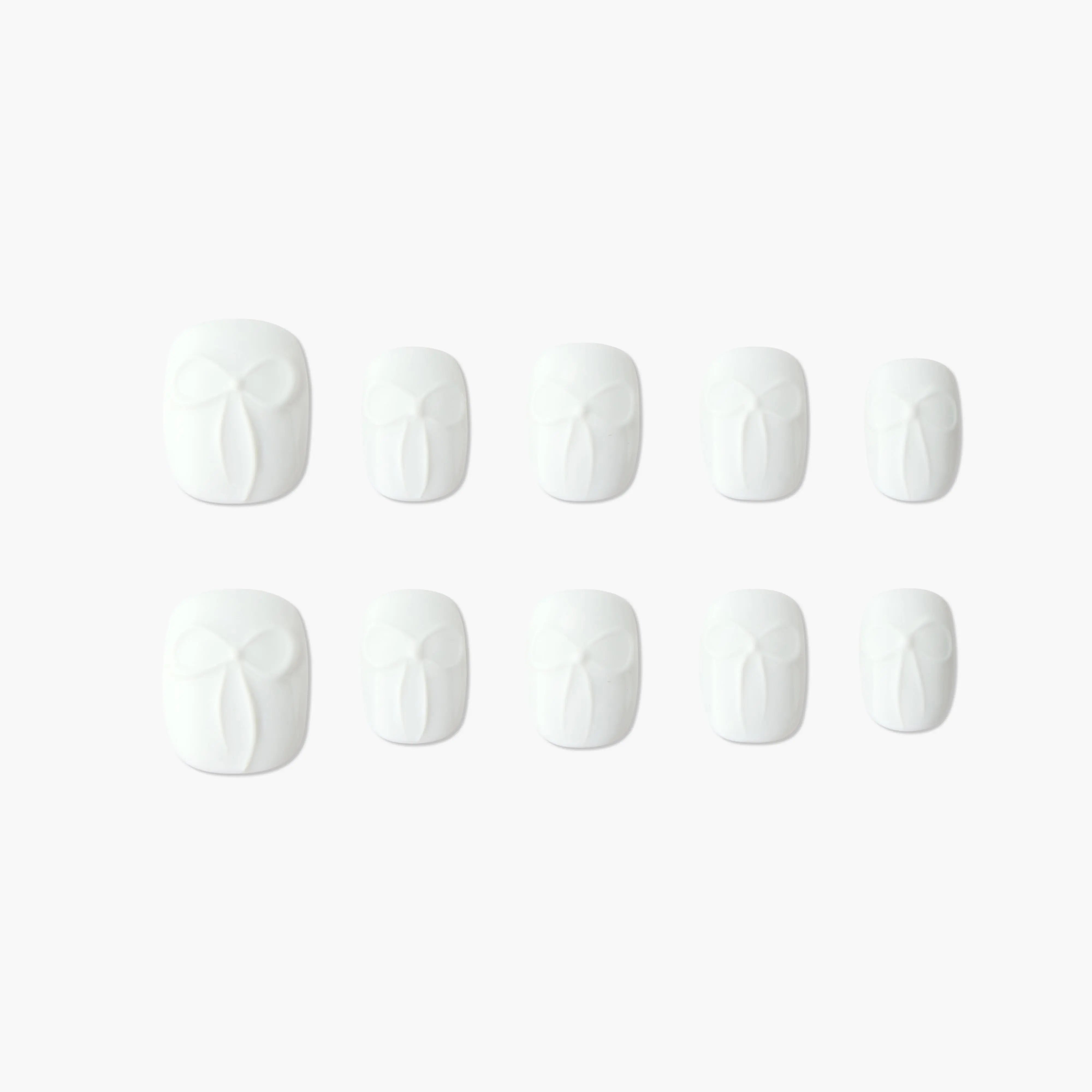 Laço Branco Puro apresenta uma base branca brilhante combinada com designs de laço 3D, exibindo uma mistura única de simplicidade e elegância. O acabamento brilhante e elegante adiciona um toque de sofisticação, tornando o design geral fresco e refinado. Perfeito para casamentos, noivados ou outras ocasiões graciosas, este conjunto de unhas permite que as suas pontas dos dedos brilhem com pureza e brilho.