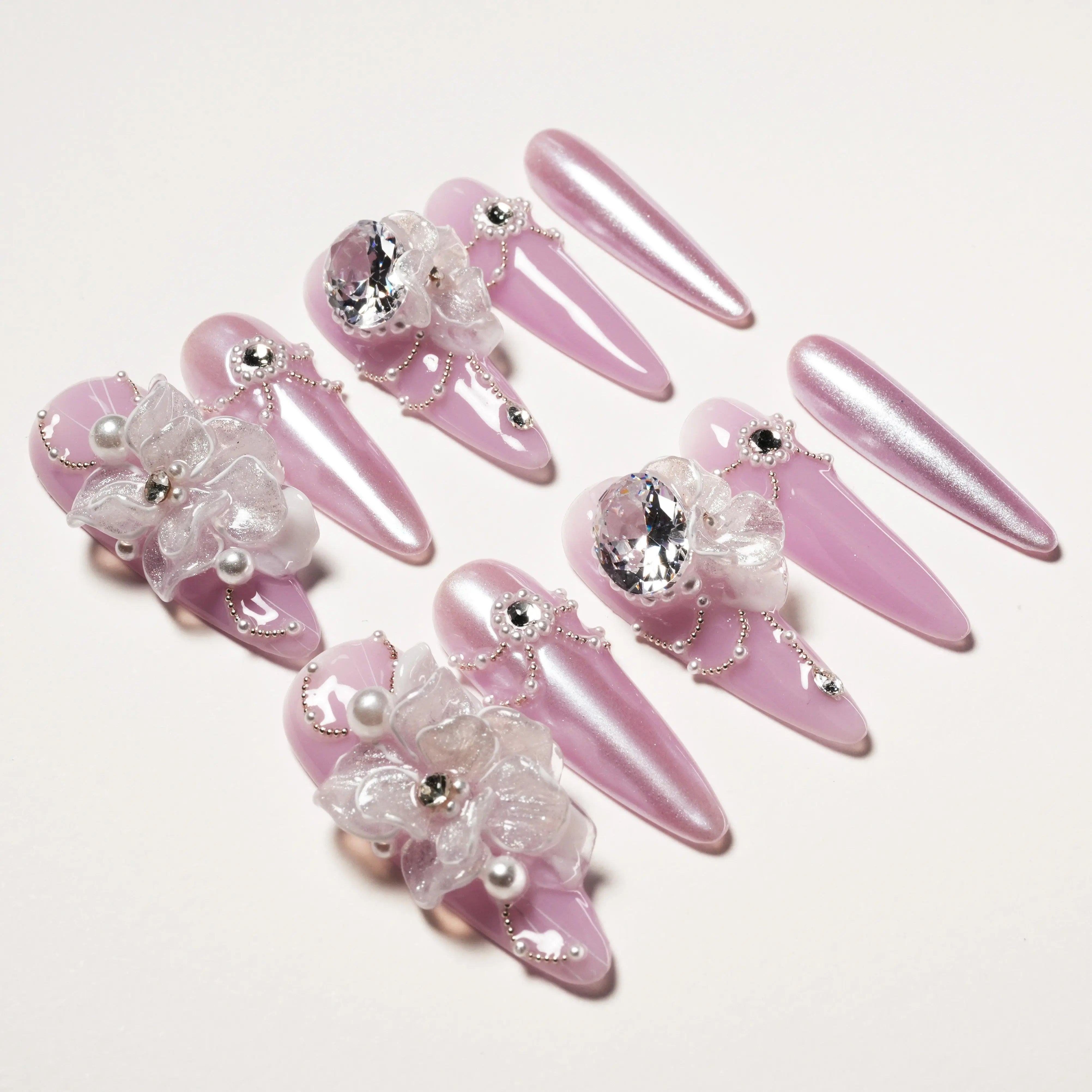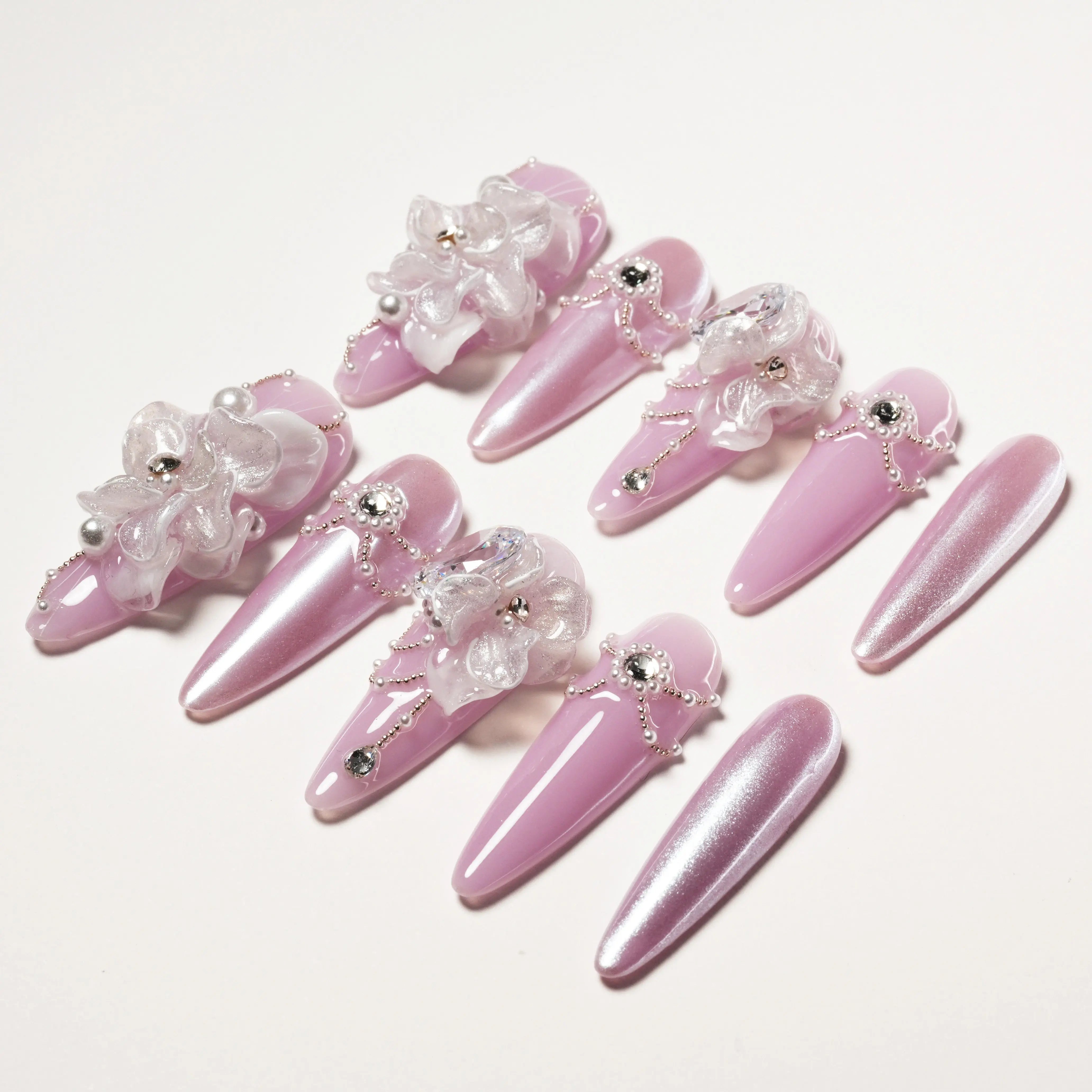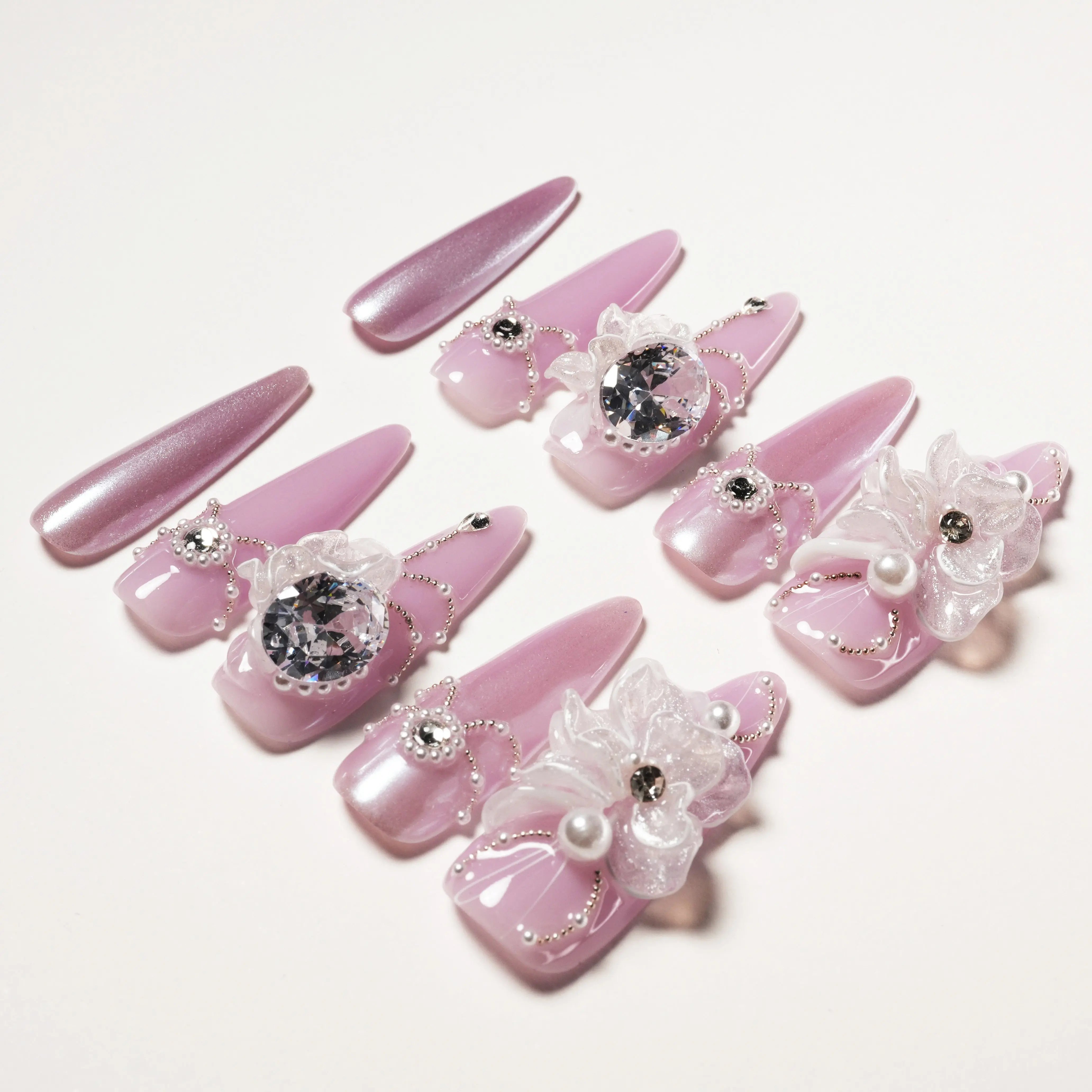 As unhas autocolantes "Purple Dream Blossom" apresentam uma base roxa suave, adornada com requintadas decorações florais transparentes e brilhantes cristais, criando uma combinação perfeita de elegância e sonho. As flores delicadas e as correntes de pérolas em cada unha transmitem uma vibração romântica suave. O brilho roxo suave e os detalhes florais adicionam doçura e luxo às suas pontas dos dedos. Seja para uso diário ou ocasiões especiais, este design exala charme e refinamento únicos.