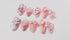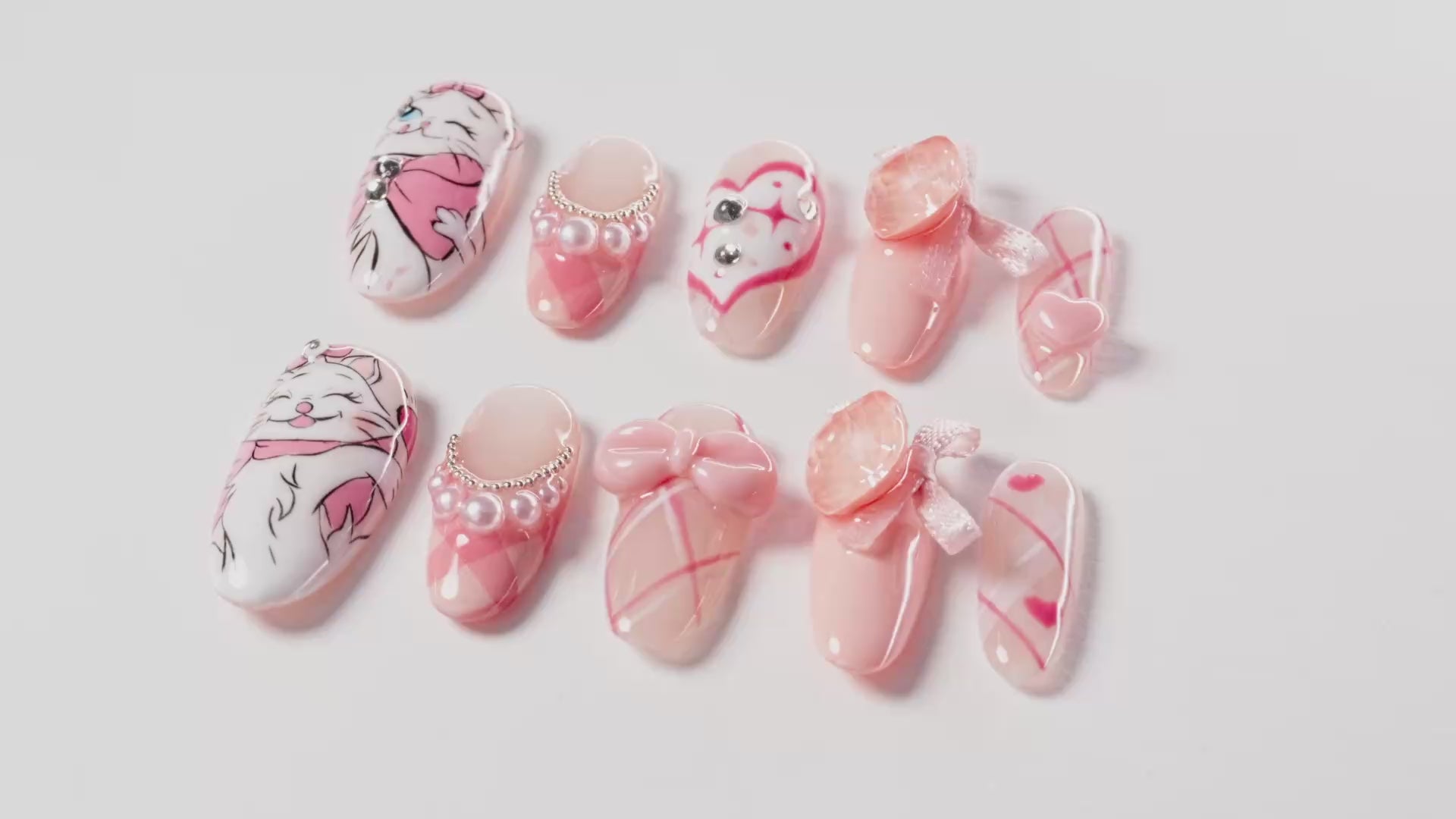 Purrfectly Pink é um design encantador e delicioso que combina imagens lúdicas de gatinhos com tons suaves de rosa pastel. Apresentando um gatinho fofo a usar uma gravata borboleta rosa, detalhes em pérola e motivos de coração, este conjunto traz um toque caprichoso e feminino às suas unhas. O fundo em gradiente suave e os detalhes intrincados de laços e padrões geométricos elevam ainda mais a estética doce e elegante. Perfeito para amantes de gatos ou para quem procura um design de unhas fofo e delicado.