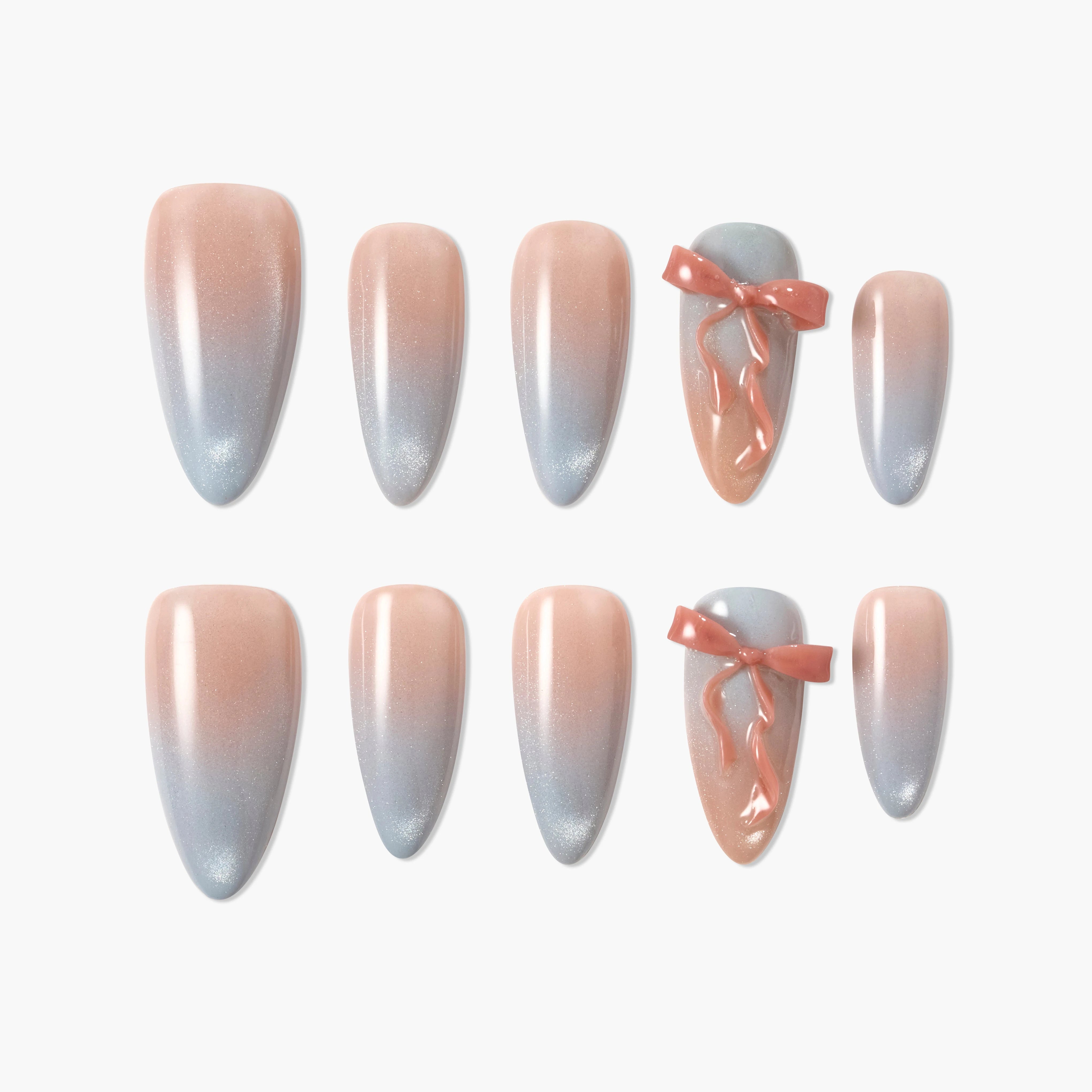 As unhas postiças "Emily’s Ribbon Dance" são feitas à mão e apresentam uma base em gradiente suave azul-rosa, adornada com detalhes 3D em forma de fita para um visual gracioso e doce. Cada peça é feita à mão para um ajuste seguro e reutilizável—perfeito para casamentos, encontros e estilos elegantes do dia a dia.