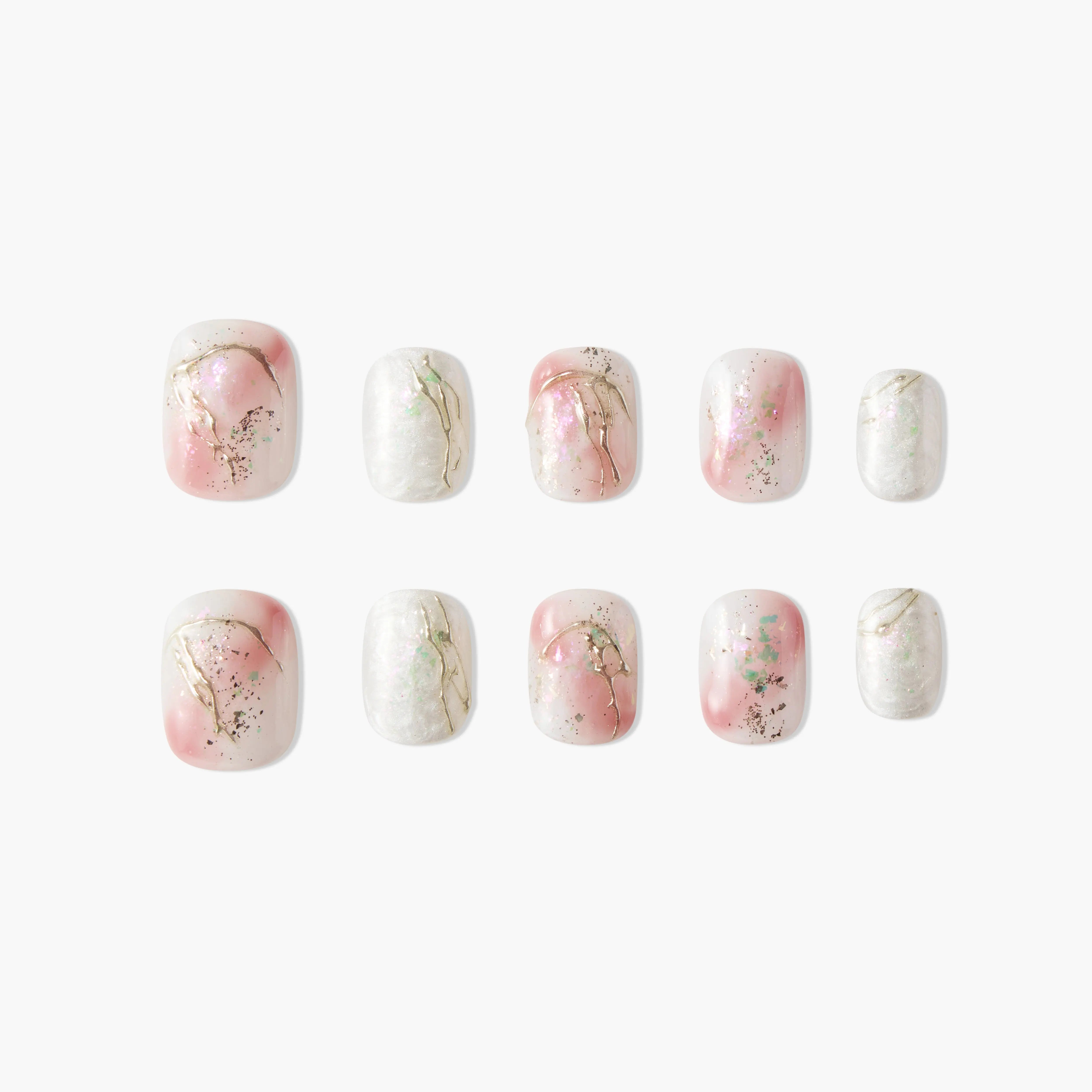Serene Blossom combina gradientes suaves de rosa com elegantes acentos dourados e delicados brilhos de glitter. O design evoca uma estética floral e pacífica, misturando a calma da natureza com um toque de sofisticação e luxo.