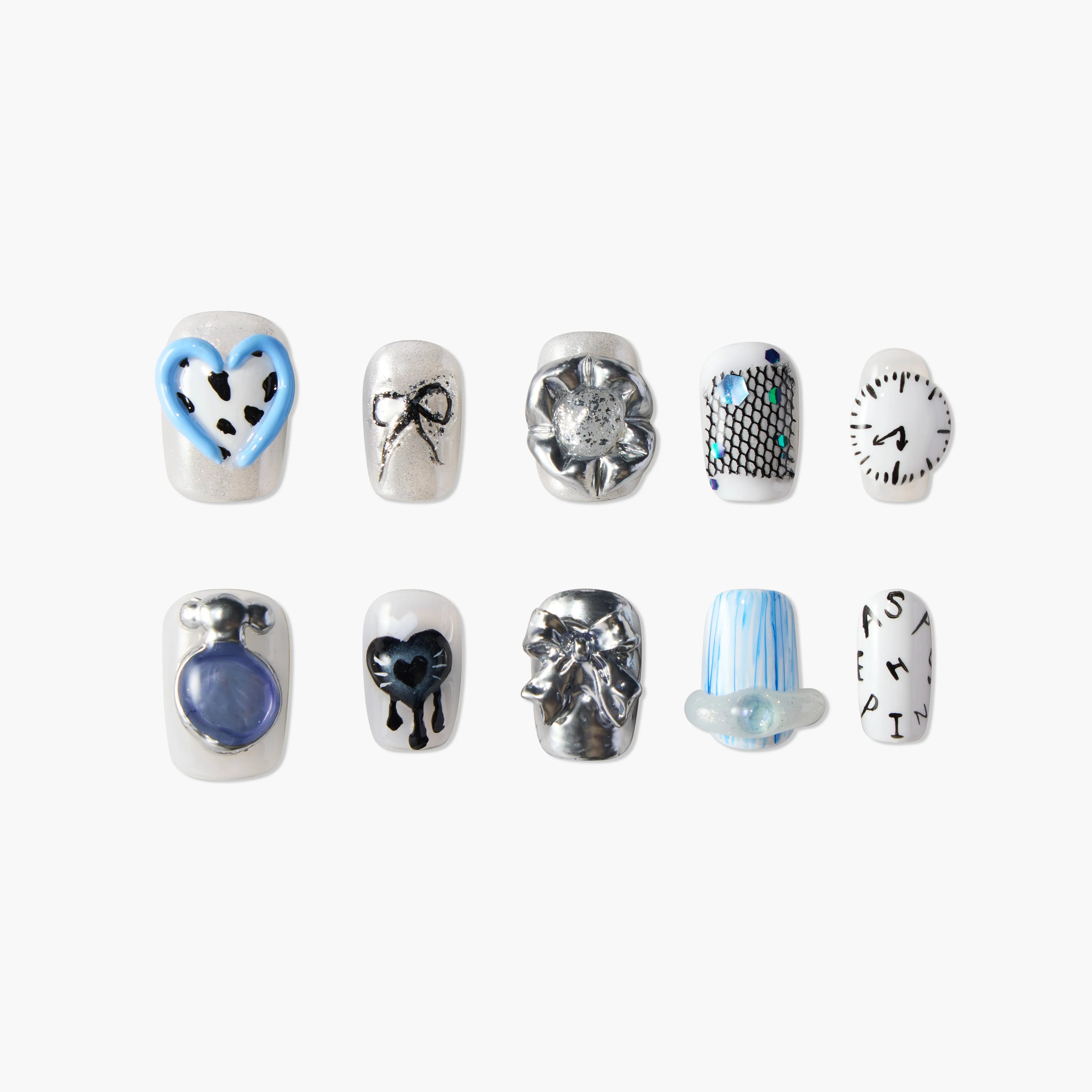 Silver Whimsy apresenta uma mistura única de designs divertidos e detalhes metálicos, com uma combinação de corações, laços e símbolos peculiares. A base suave em prata e branco é adornada com toques metálicos e elementos inesperados, perfeita para quem gosta de um pouco de diversão e sofisticação na sua arte de unhas.