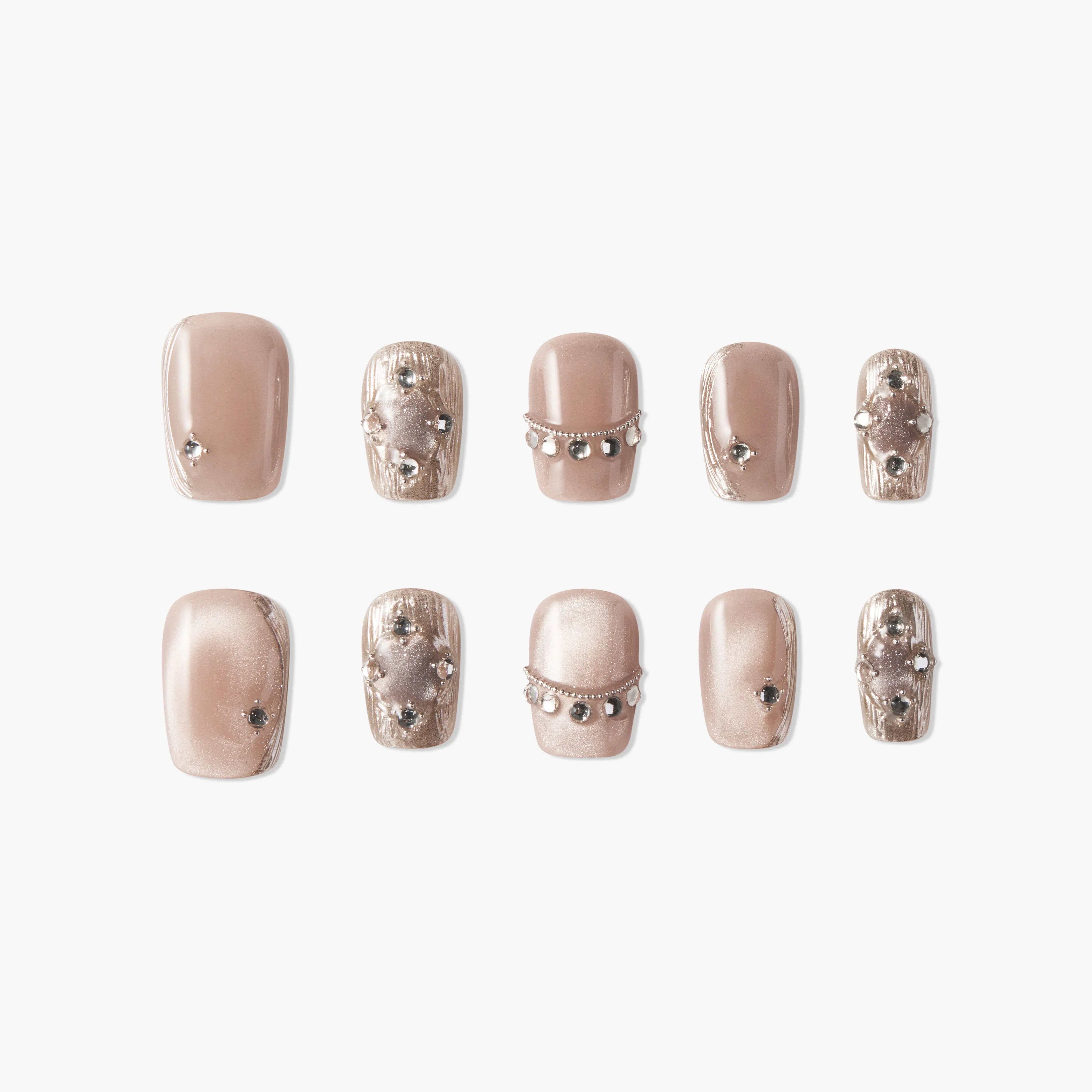 Elegância Cintilante combina tons neutros suaves com adornos elegantes. A base nude cintilante é realçada com correntes delicadas e pedras preciosas brilhantes, criando um visual refinado e sofisticado. Perfeito para quem procura glamour discreto com um toque de luxo.