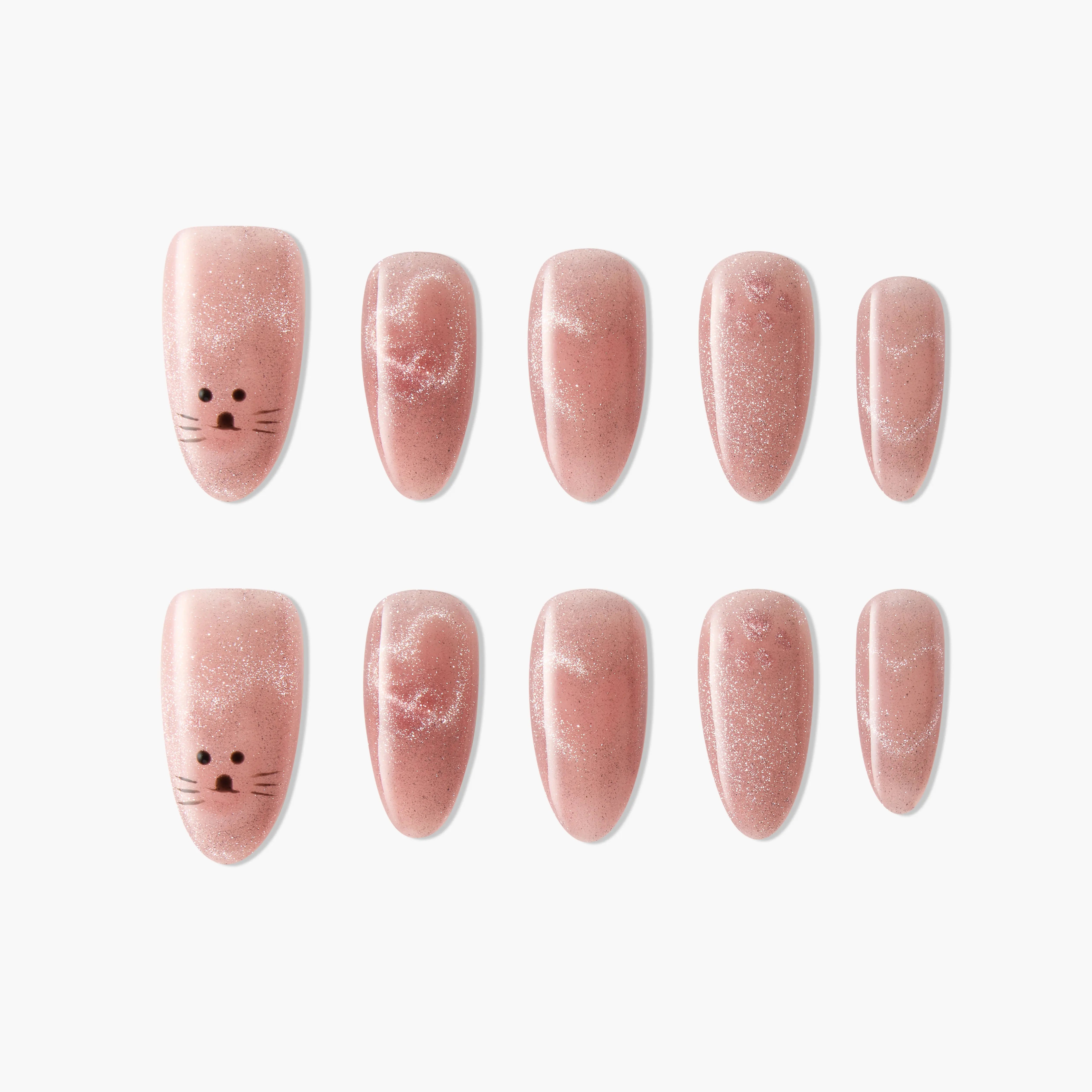 As unhas postiças Sparkling Kitty combinam um rosa suave com um adorável desenho de rosto de gato e detalhes delicados em glitter, adicionando um toque divertido. Ideais para uso diário ou ocasiões especiais, exibindo um visual doce e encantador.