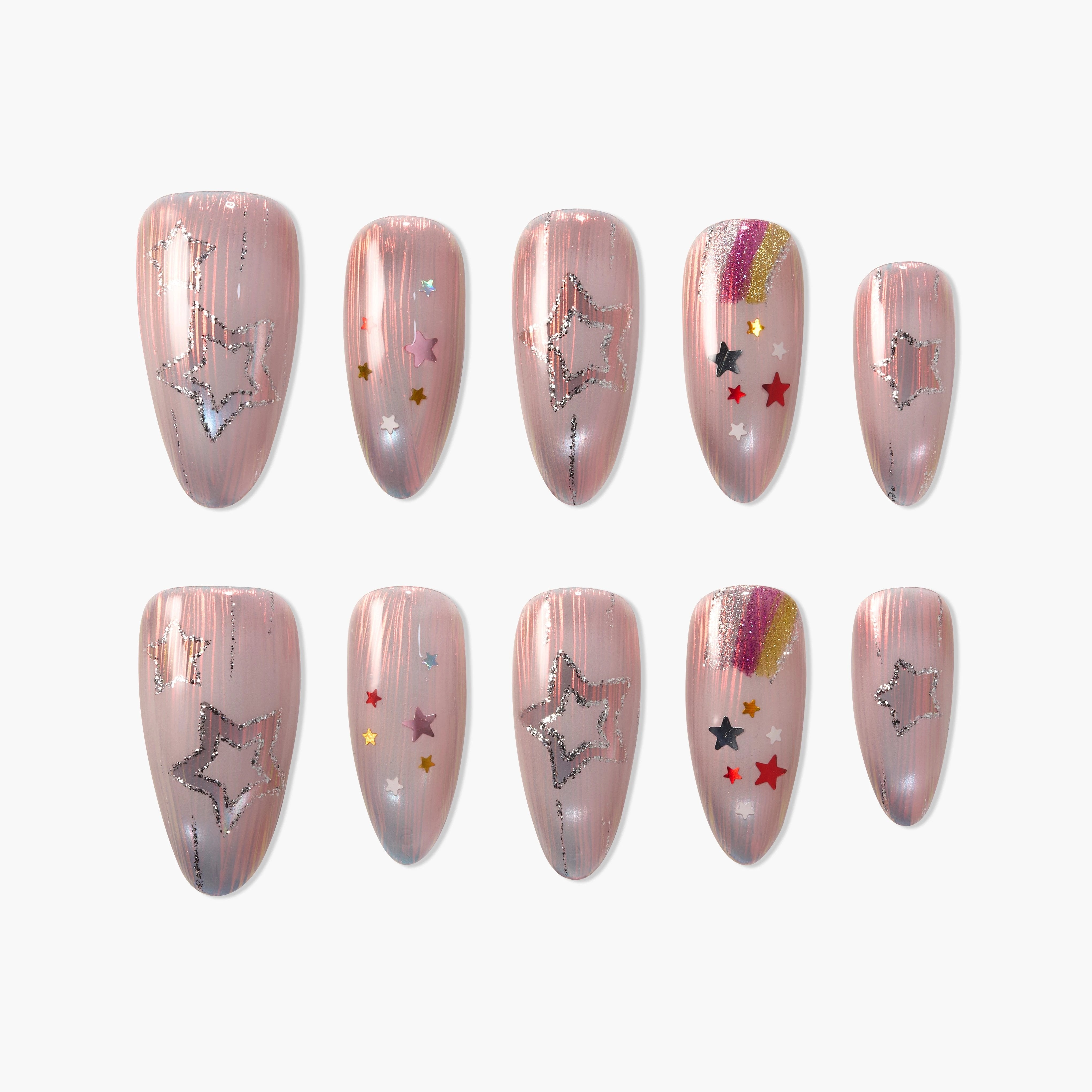 Stardust Trail é inspirado por estrelas cadentes a deslizar pelo céu crepuscular. Uma base suave nude-rosa é pincelada com um brilho metálico subtil, salpicada com confetes coloridos em forma de estrela e delicados contornos prateados que traçam constelações em movimento. O destaque com glitter arco-íris adiciona um brilho divertido, equilibrando a fantasia cósmica com um acabamento moderno e brilhante — para sonhadores que adoram brilhar sem esforço.
