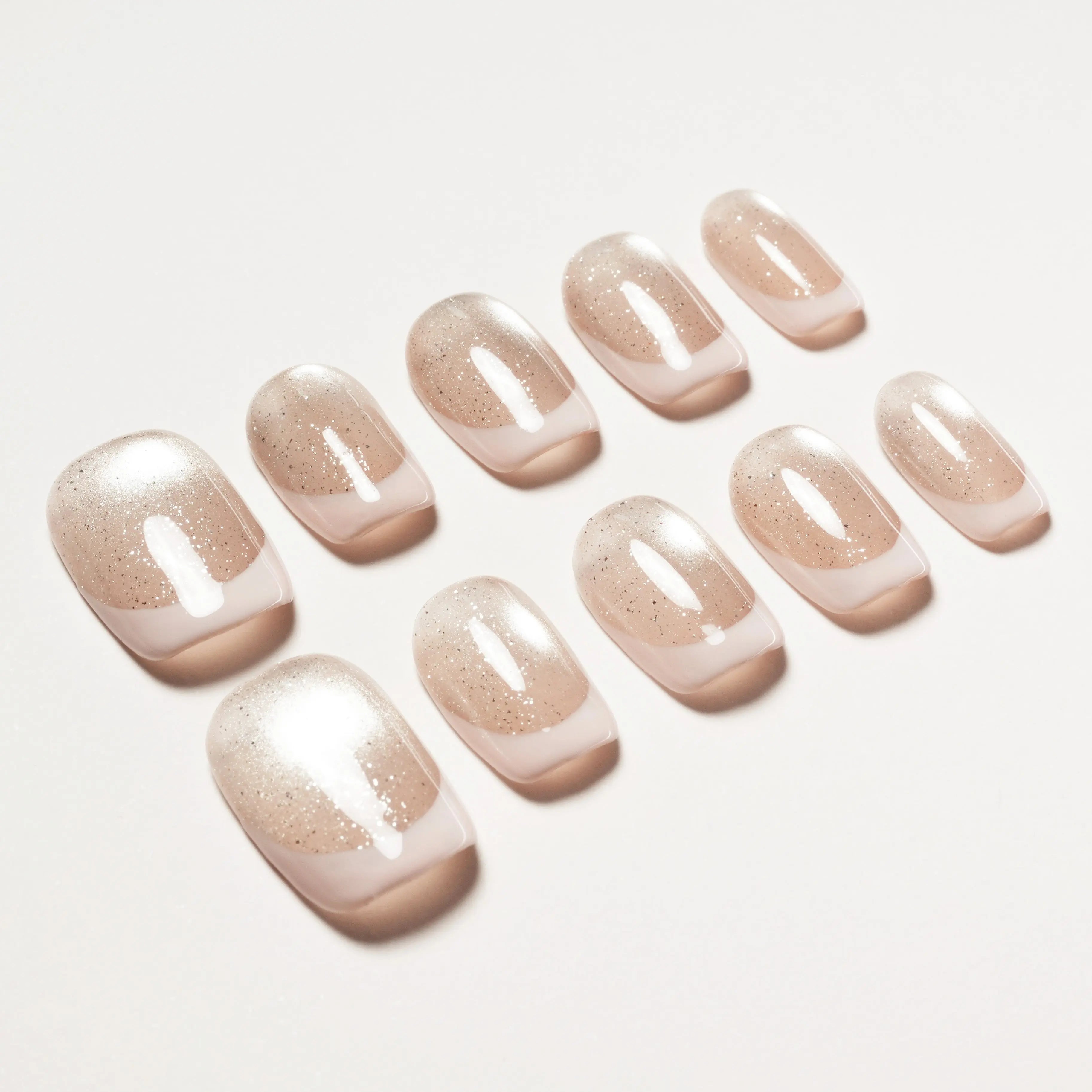 As unhas autocolantes "Starlight Blush" apresentam um gradiente rosa suave e um brilho delicado, oferecendo um design fresco e elegante. O efeito gradiente e o brilho subtil combinam-se para adicionar um toque de brilho às suas pontas dos dedos. Este design equilibra perfeitamente simplicidade e sofisticação, tornando-o ideal para qualquer ocasião, adicionando um charme natural e gracioso às suas unhas.