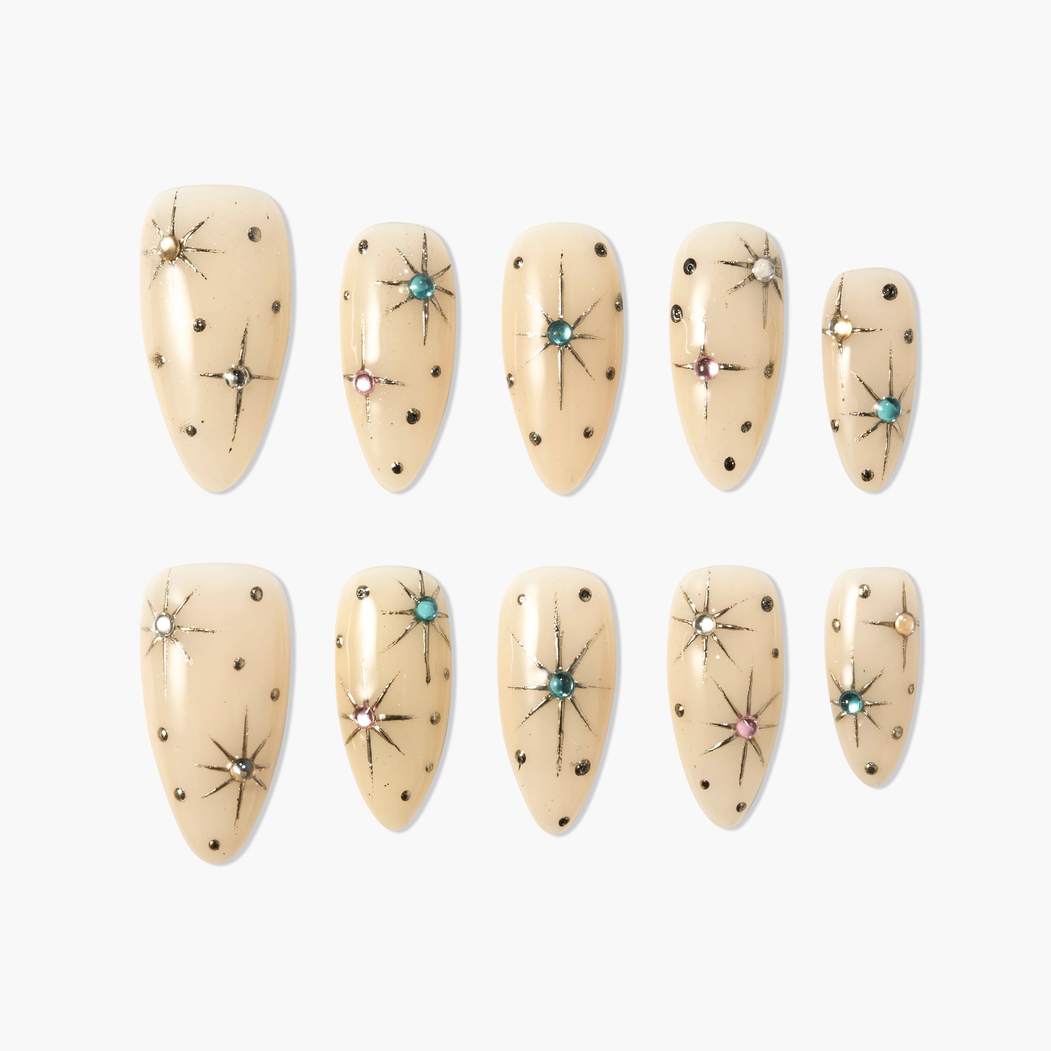 As unhas postiças artesanais Emily’s Starlight Gem apresentam uma base bege suave adornada com delicadas linhas pretas em forma de explosão de estrelas, acentuadas com pedras de cristal coloridas e pontos cintilantes. O design captura o brilho de um céu estrelado — simples, mas glamoroso. Cada peça é feita à mão para um ajuste seguro e reutilizável, perfeito para encontros, festas ou um estilo diário elegante.