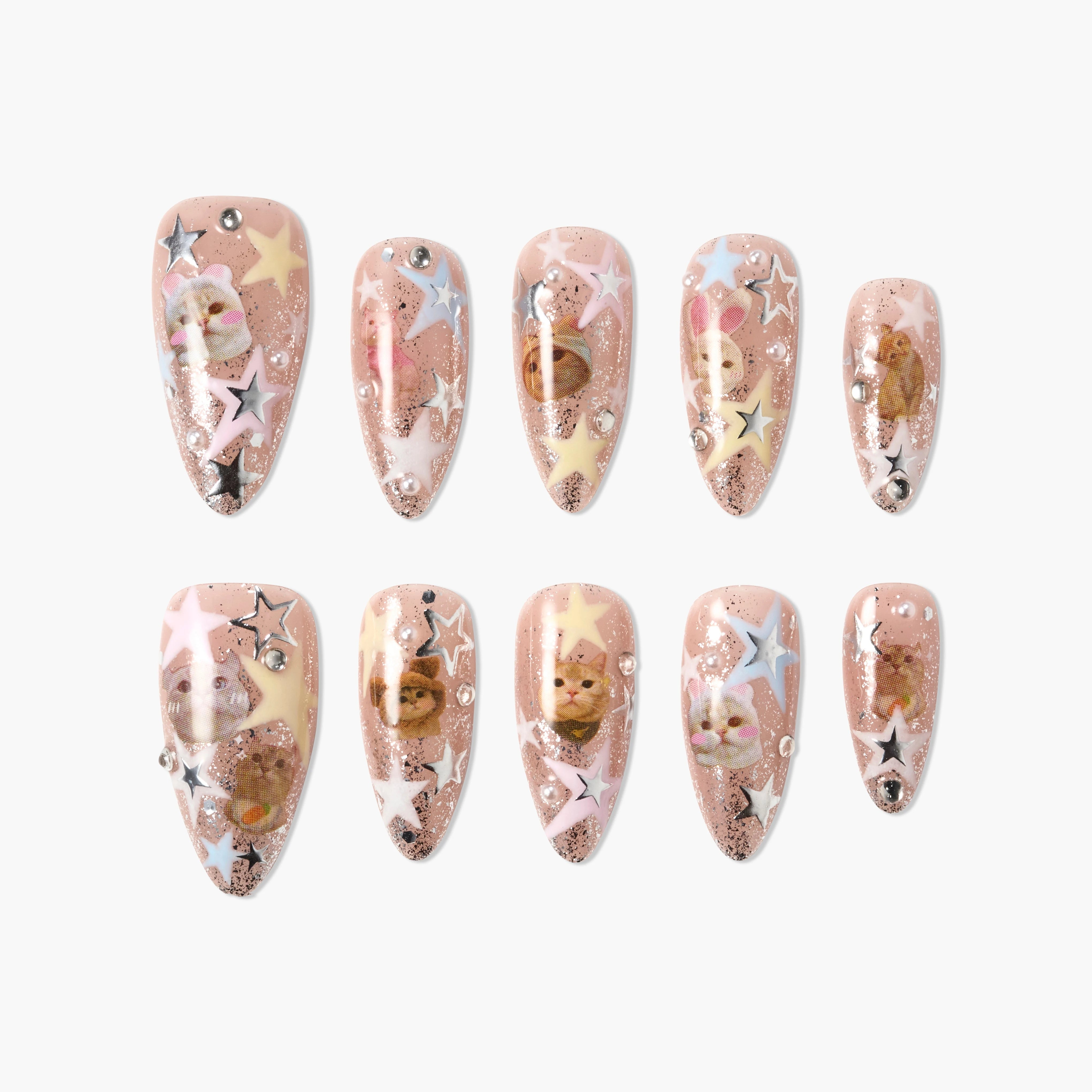 As unhas postiças feitas à mão Emily’s Starry Pets apresentam uma base nude-rosa adornada com estrelas, pérolas e ilustrações de animais fofos para um visual sonhador e divertido. Cada peça é feita à mão para um ajuste seguro e reutilizável—perfeito para uso diário, festas e estilos fantásticos.
