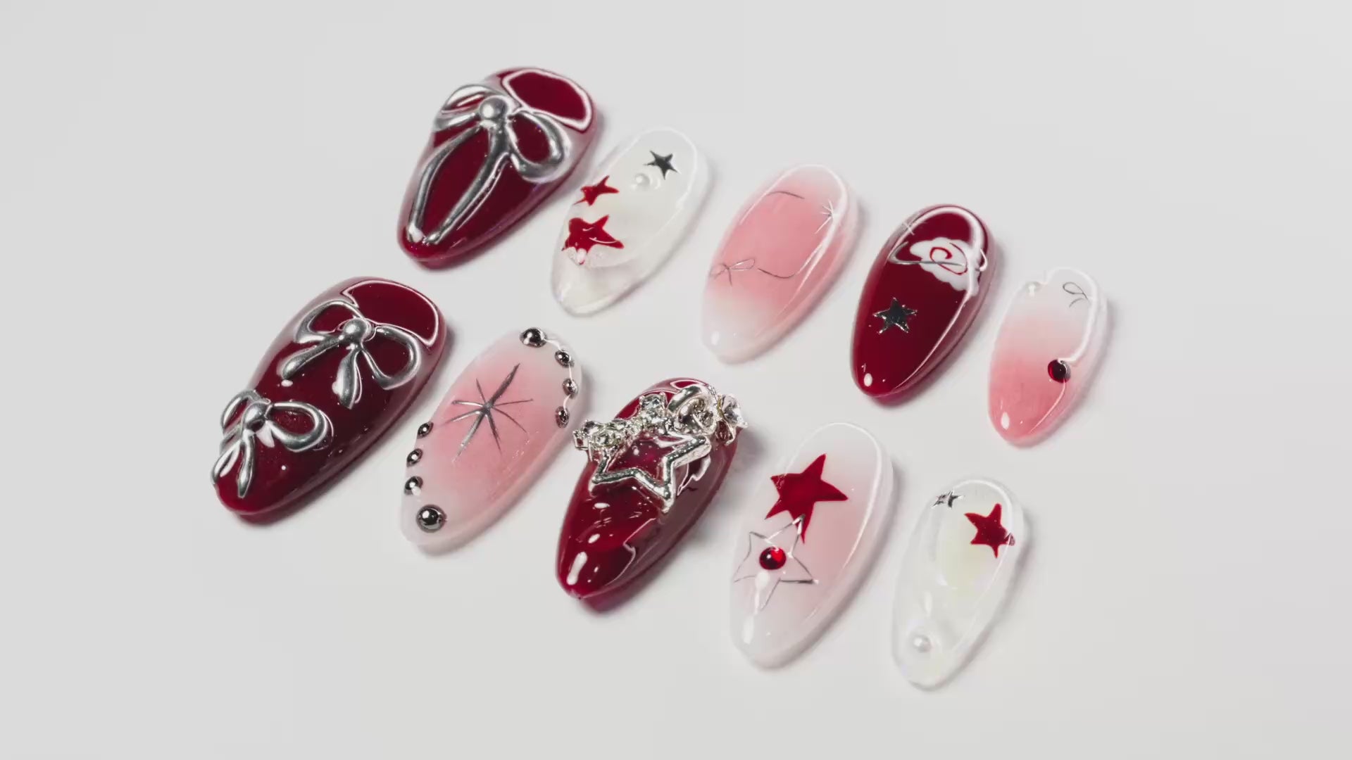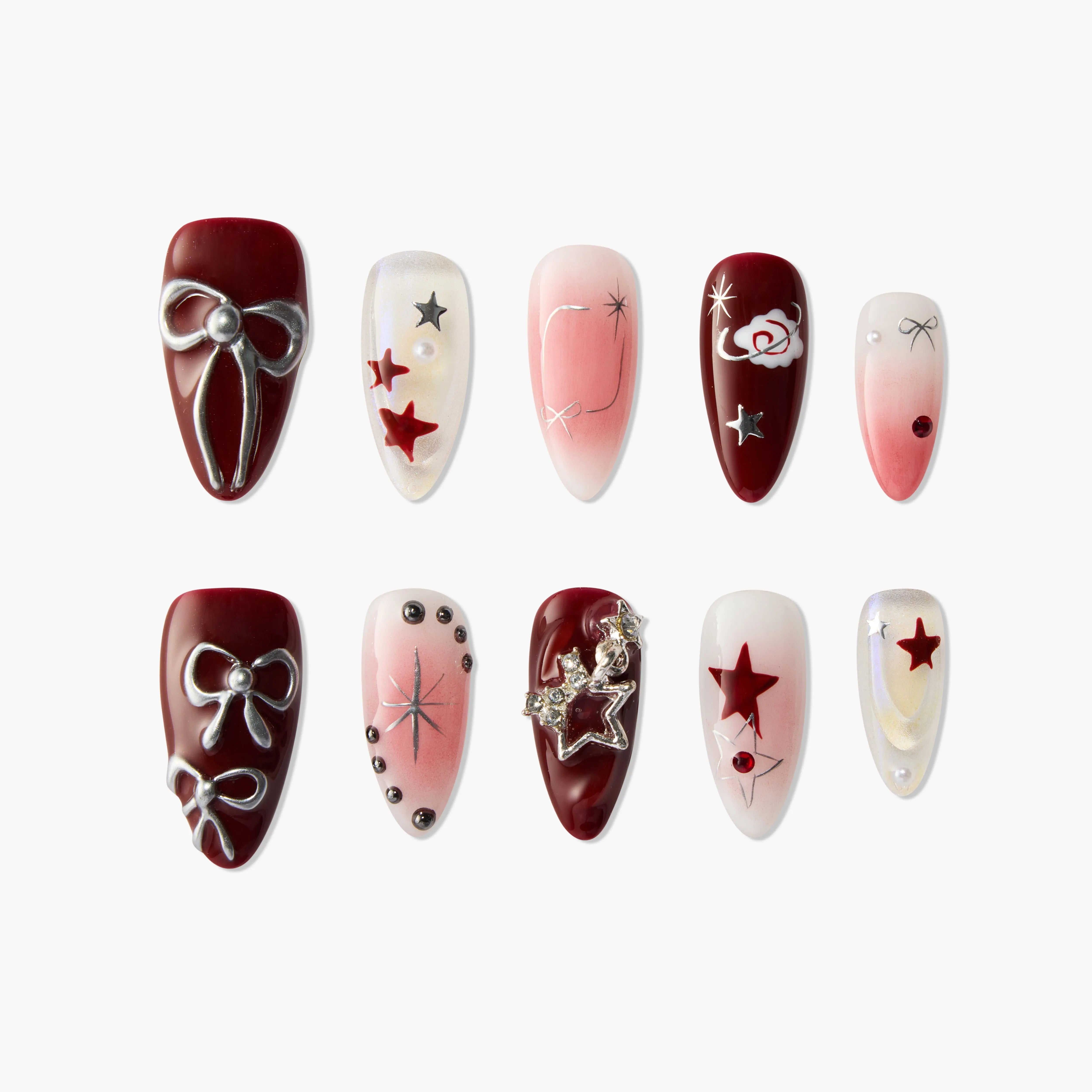 As unhas reutilizáveis Starry Red Bow apresentam um design em vermelho profundo e branco em gradiente, adornadas com delicados laços, estrelas e cristais. As unhas brilham como o céu noturno, perfeitas para ocasiões românticas ou festivas. Reutilizáveis para maior conveniência, adicionando charme às suas pontas dos dedos.