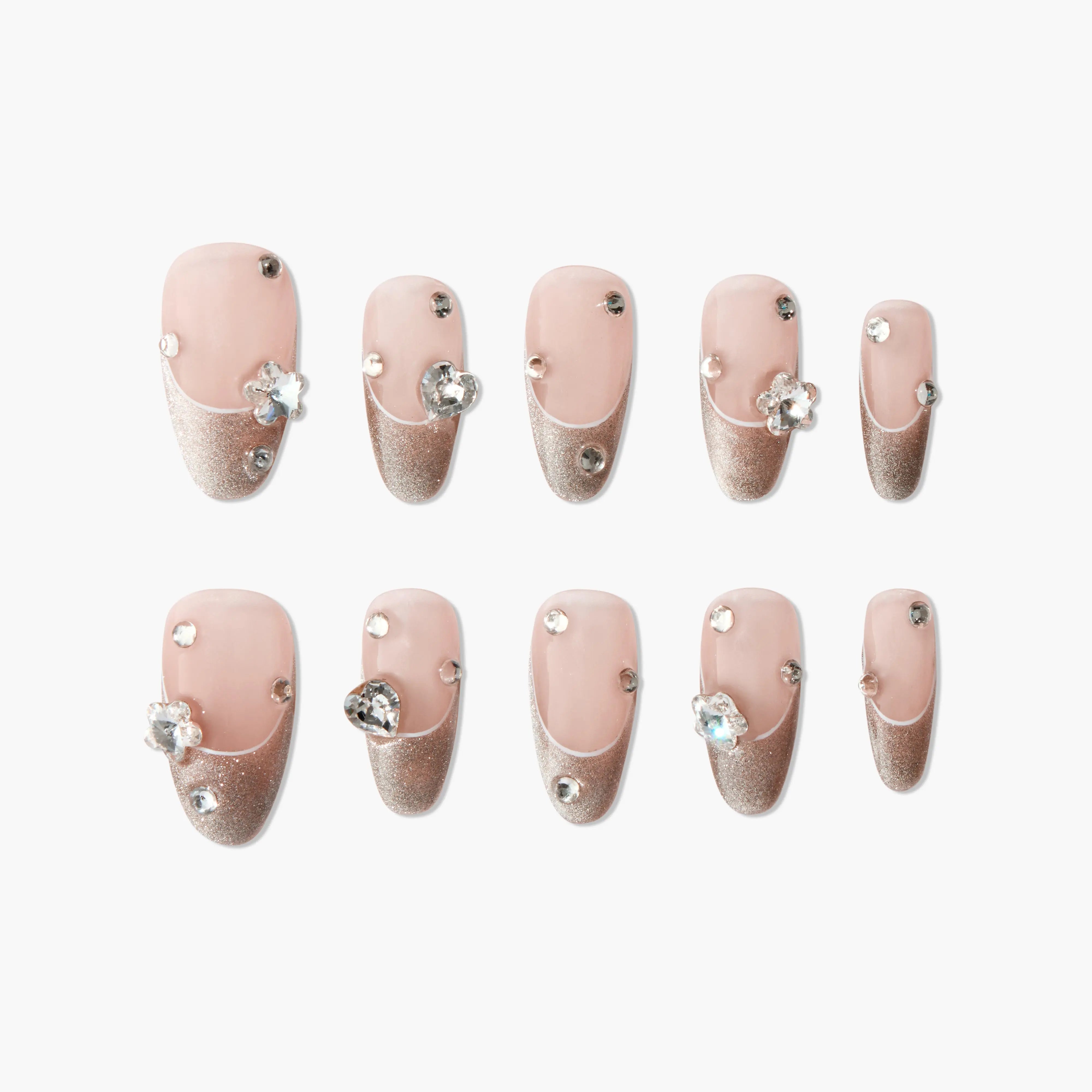 Glamour Francês Estelar As unhas Press-On apresentam uma base rosa nude combinada com um design francês em gradiente dourado-rosado cintilante, fundindo perfeitamente elegância e luxo. Adornadas com brilhantes strass e enfeites florais 3D, adicionam um toque de romance e sofisticação. Ideal para casamentos, galas ou qualquer ocasião requintada, este conjunto de unhas permite que as suas pontas dos dedos brilhem como estrelas.