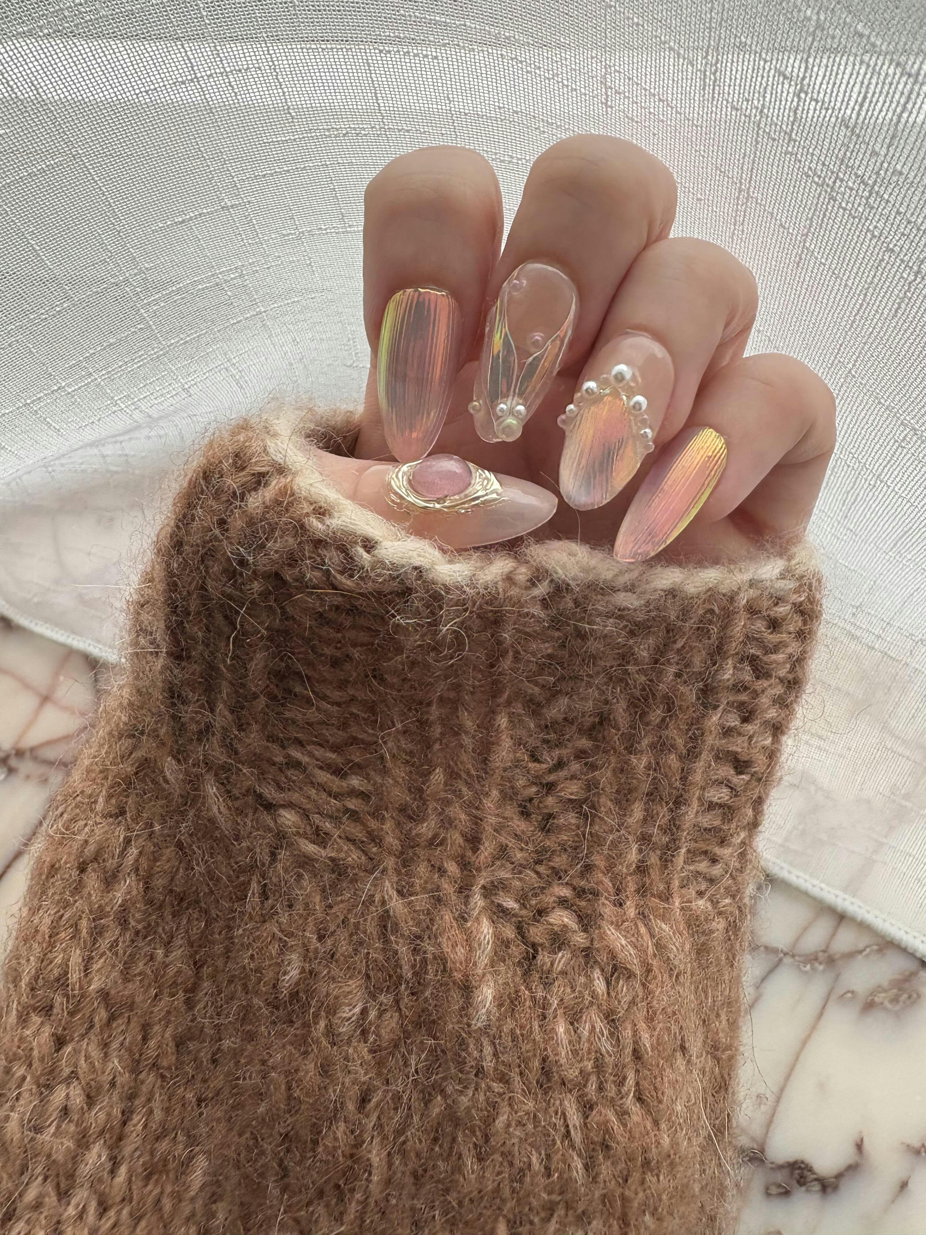 Brilho Pérola Estelar apresenta um tom rosa nude combinado com um cintilar arco-íris hipnotizante, evocando o brilho da luz das estrelas. O design incorpora detalhes metálicos na moldura e adornos de pérolas, enfatizando elegância e luxo. Cada unha assemelha-se a uma pequena obra de arte, perfeita para quem procura um estilo refinado e único, tornando as suas mãos o centro das atenções.