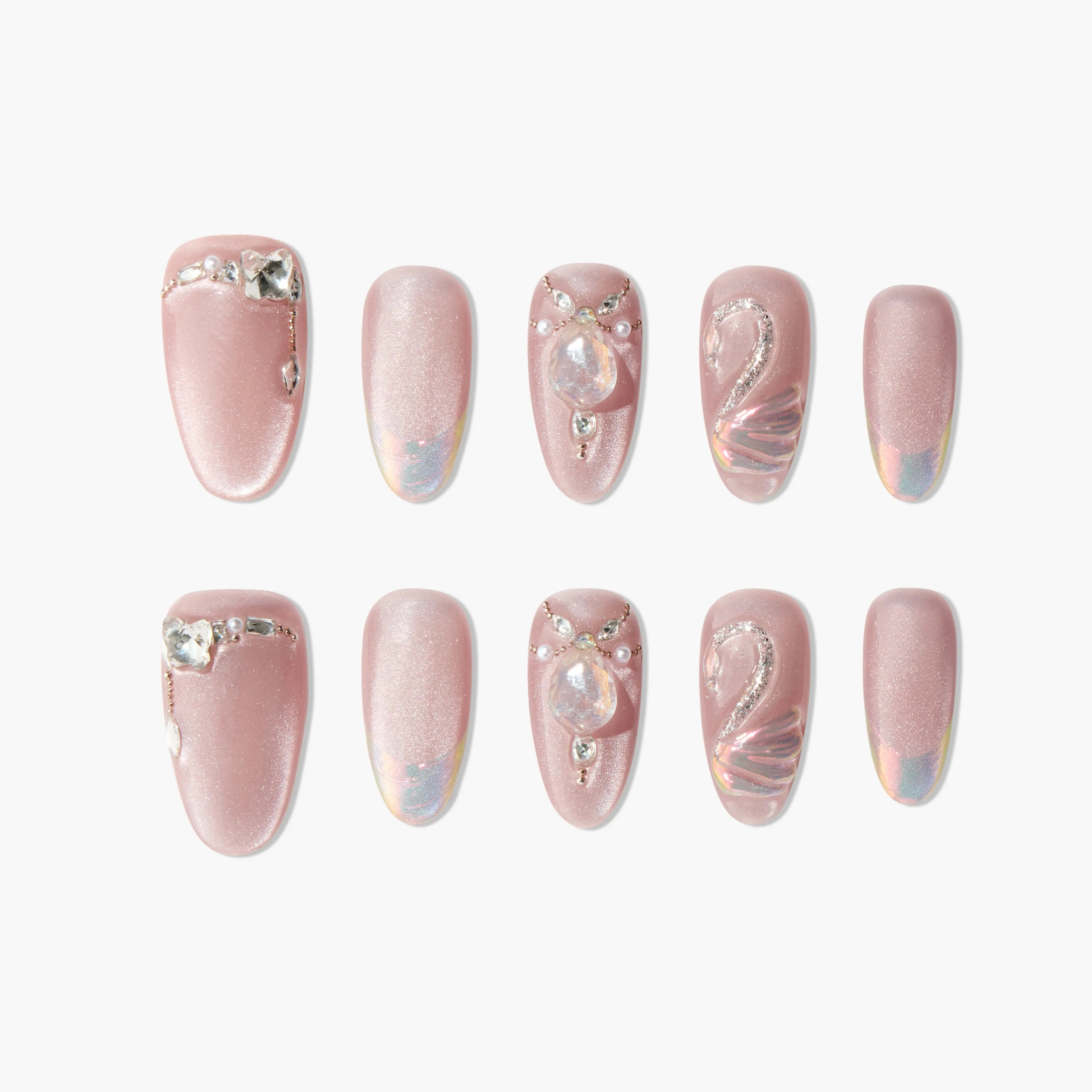 Swan Dream é uma coleção de designs elegantes que apresentam tons pastéis cintilantes, adornados com brilhantes strass e um gracioso motivo de cisne. Perfeito para um toque de luxo e sofisticação, este conjunto adiciona uma vibração serena e sonhadora a qualquer visual.