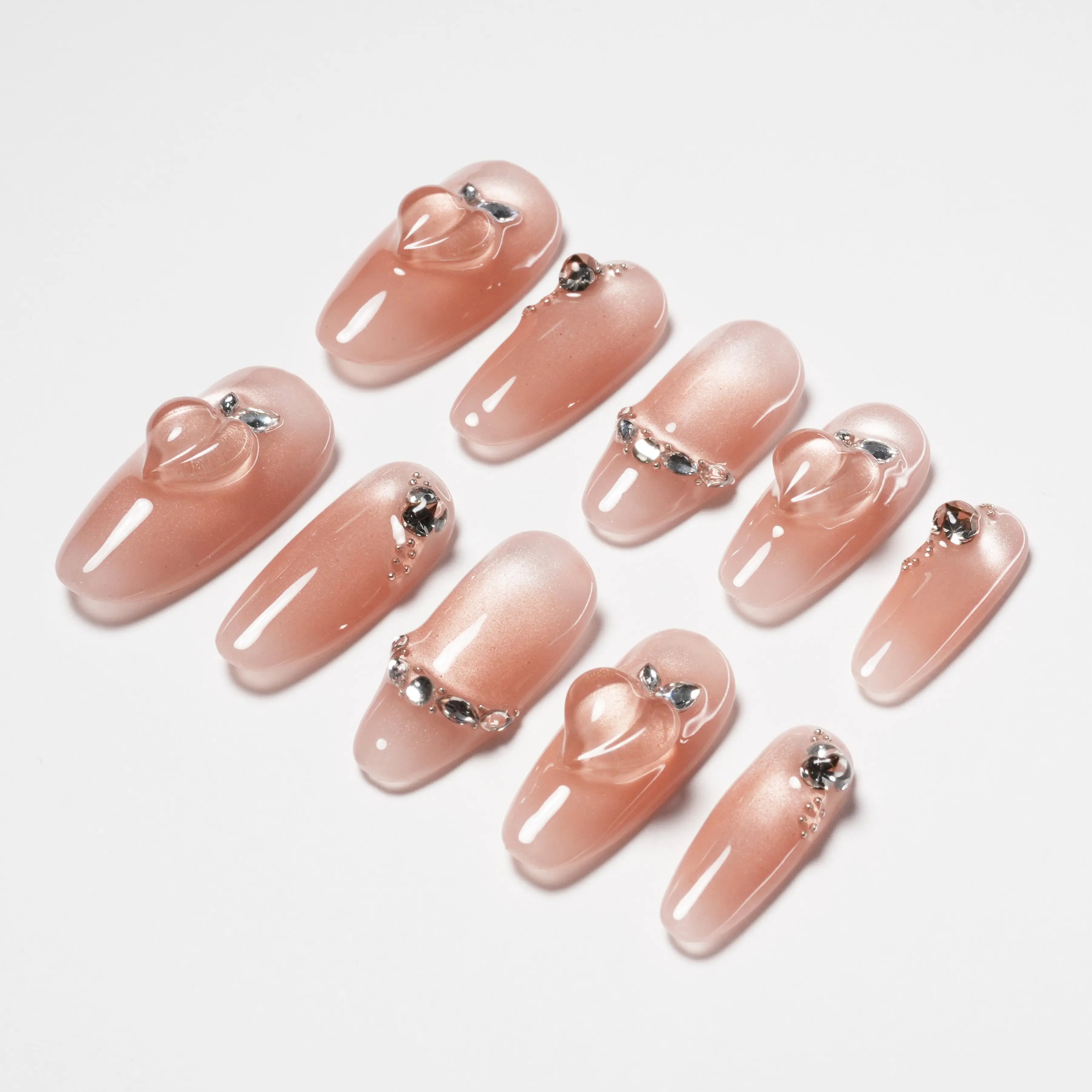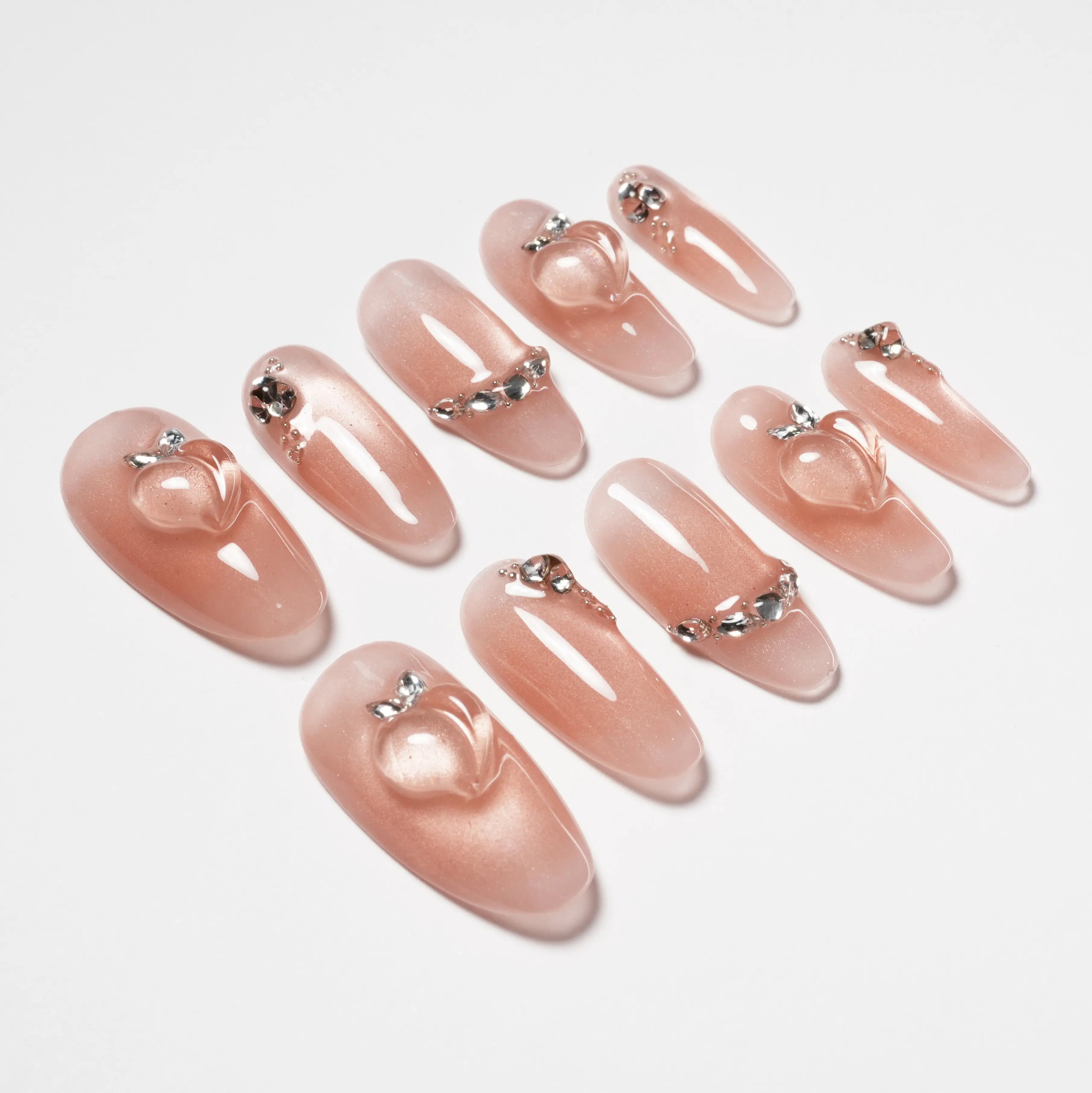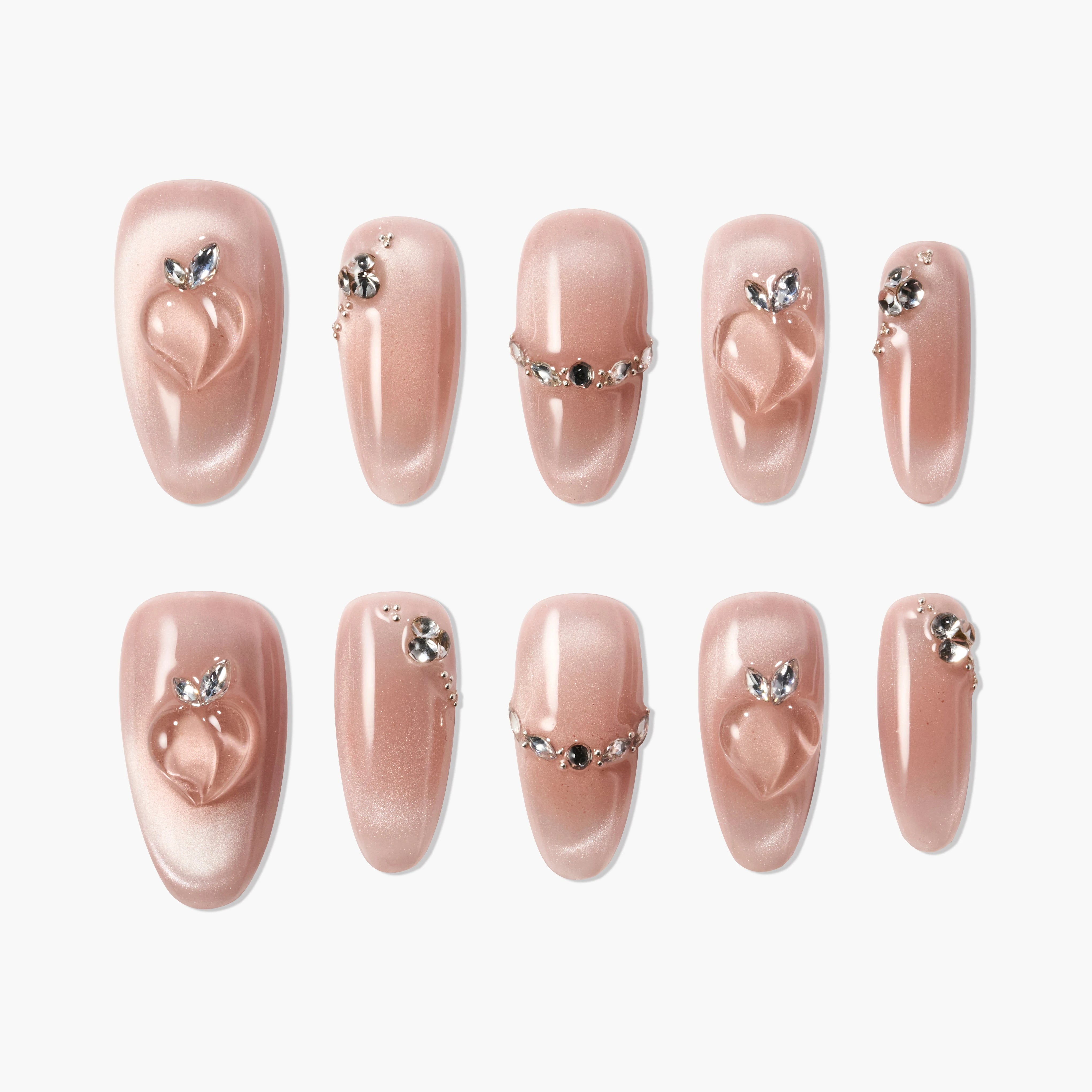 As unhas autocolantes "Sweet Kiss" apresentam uma base rosa nude suave, adornada com cristais requintados e detalhes tridimensionais em forma de coração, combinando romance e doçura na perfeição. O design único em forma de coração e os brilhantes cristais em cada unha assemelham-se a uma doce impressão de beijo nas pontas dos seus dedos, oferecendo um efeito visual quente e suave. Perfeitas para qualquer ocasião, exibindo a sua doçura e elegância.