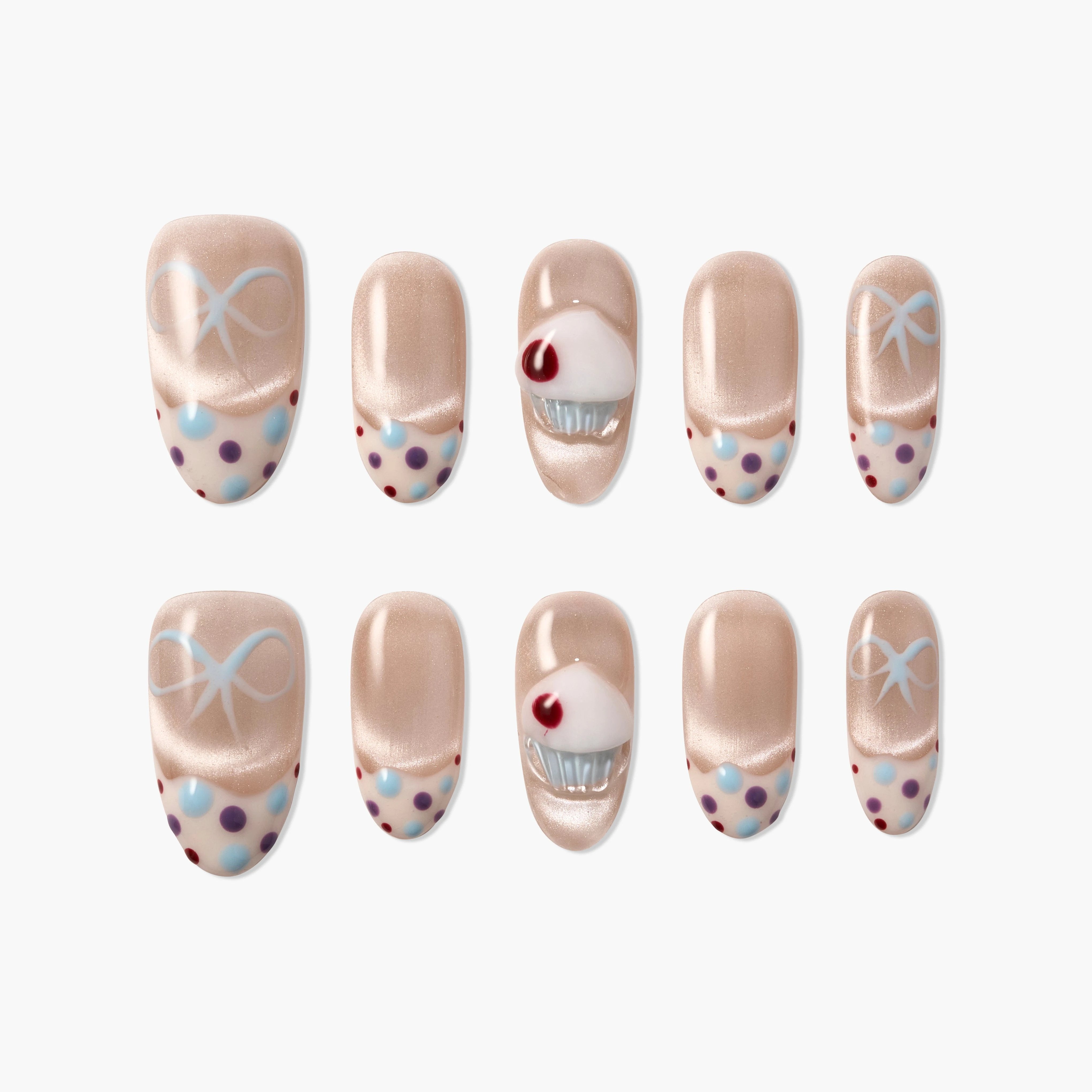 Brincalhão, sonhador e um pouco travesso — Sweet Mischief mistura pontos pastel, motivos de fita e um destaque 3D de cupcake para aquele charme irresistivelmente fofo e peculiar. Perfeito para quem gosta da sua doçura com um toque especial.