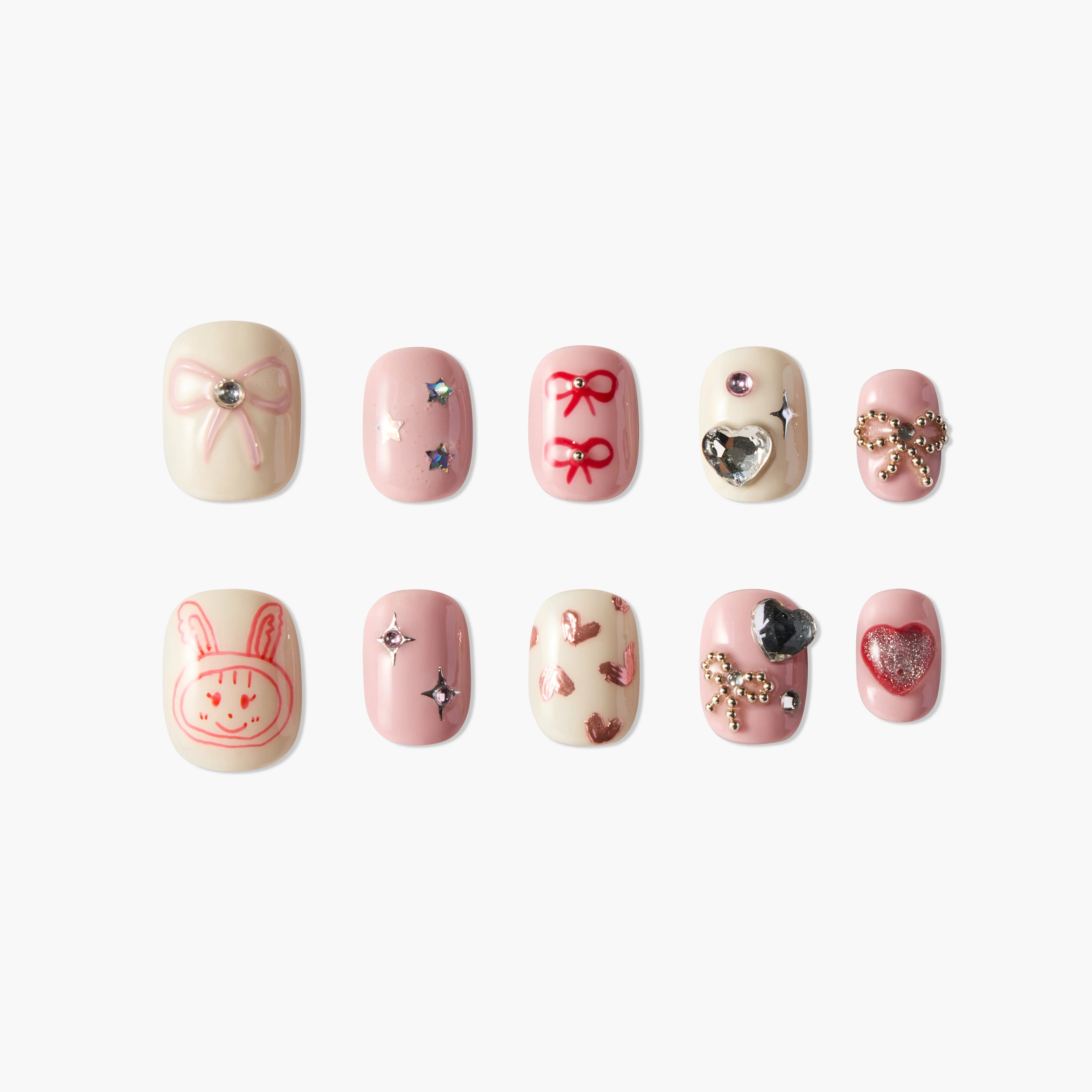 Doce Encanto Rosa celebra a feminilidade divertida. Adornado com laços, corações, estrelas e um desenho de coelhinho fofo, este design captura a essência do encanto e da fantasia. Perfeito para quem adora uma mistura de brilho e detalhes adoráveis.