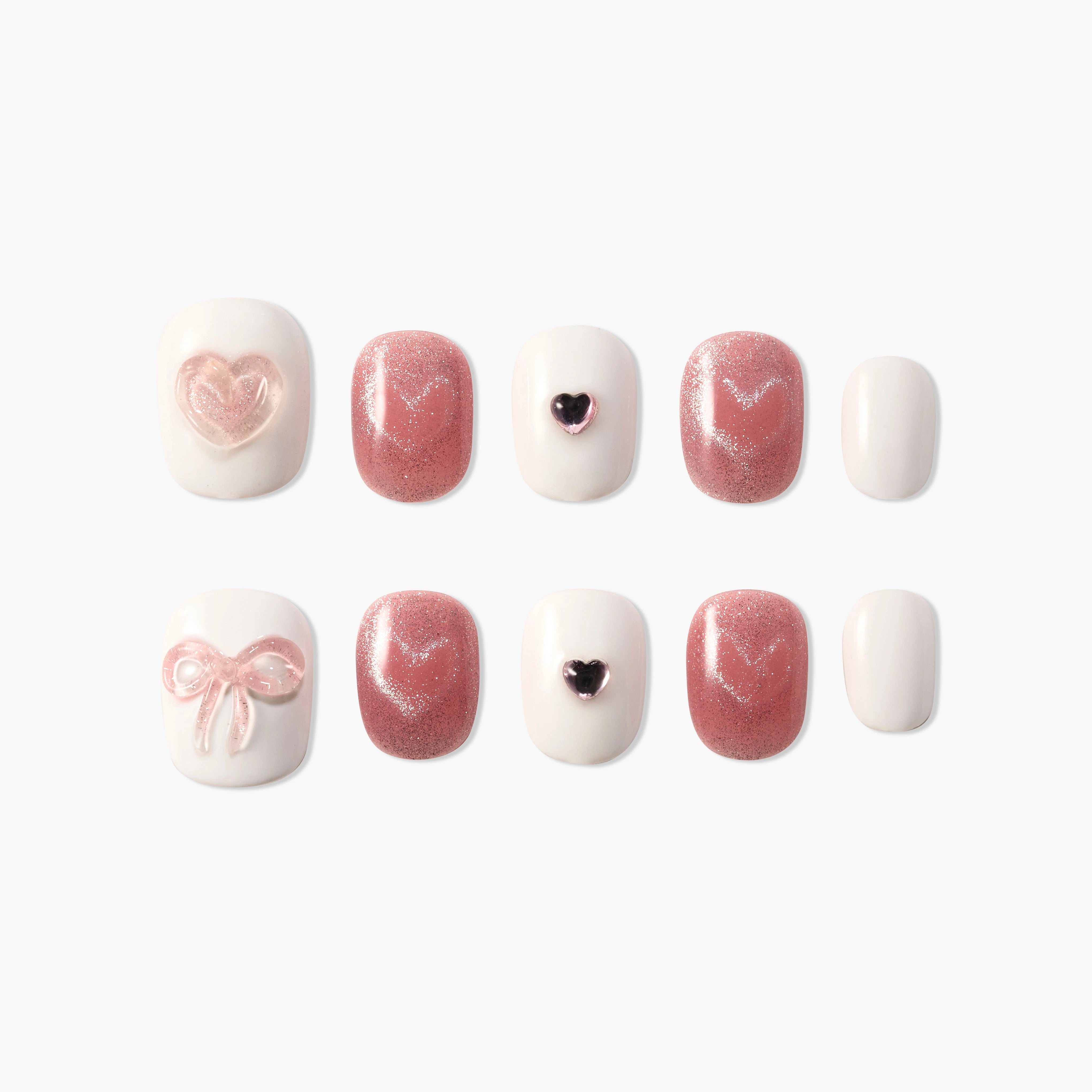 Apaixone-se pelo Sweetheart Glow da Emily, uma mistura de sonho de rosa blush e branco puro. Com corações 3D, fitas e glitter cintilante, cada unha capta o suave brilho do amor e da inocência. Feito à mão com perfeição, este conjunto traz um charme romântico e kawaii, perfeito para encontros, presentes ou simplesmente para iluminar o seu dia.
