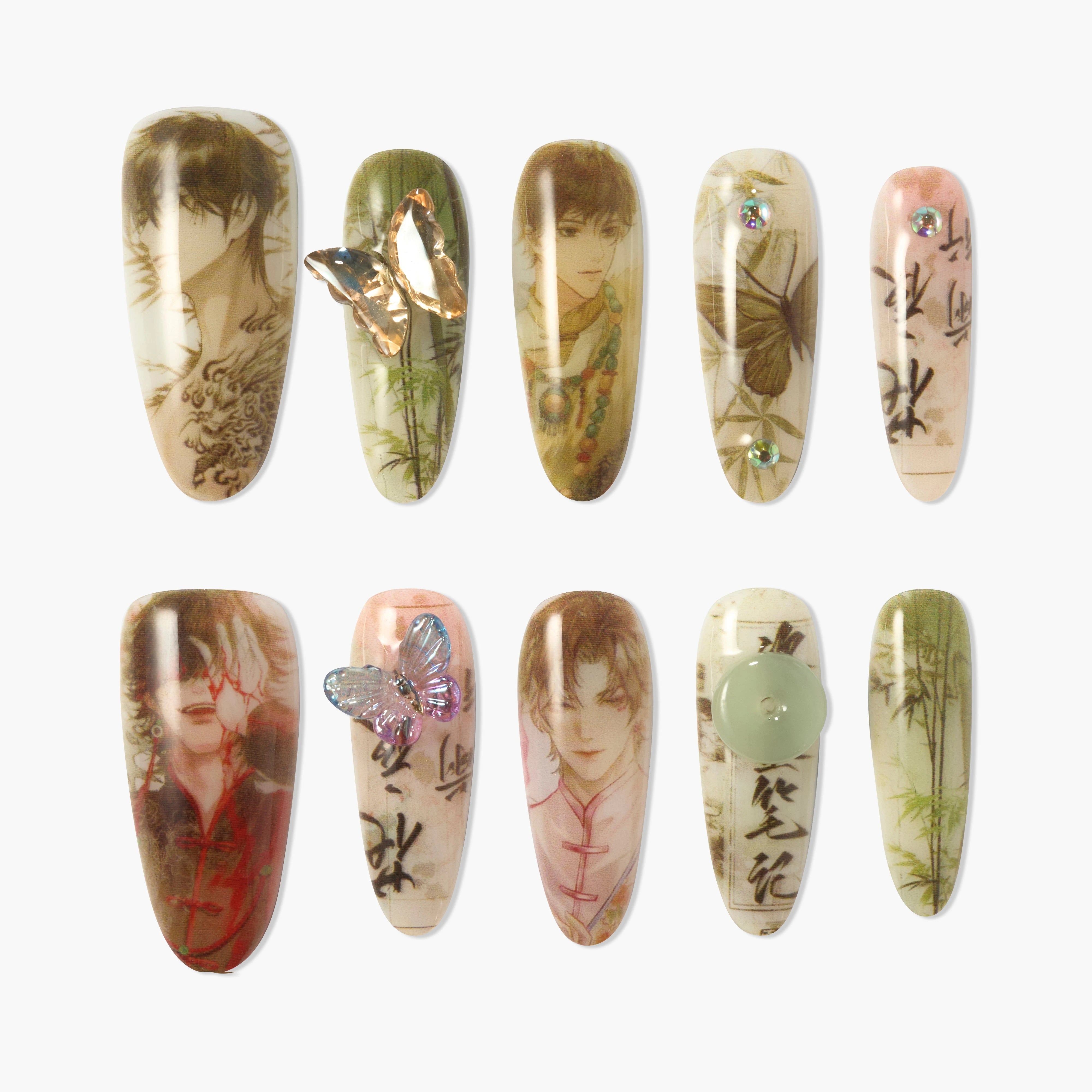 As unhas postiças artesanais Emily’s The Lost Tomb apresentam um fundo de bambu a tinta e caligrafia tradicional, combinados com ilustrações de personagens icónicos como Wu Xie, Zhang Qiling e Xiao Hua. Decoradas com borboletas 3D, amuletos semelhantes a jade e detalhes em brilhantes, este conjunto incorpora tanto elegância como mistério. Uma escolha perfeita para cosplay, eventos temáticos ou como item de colecionador.
