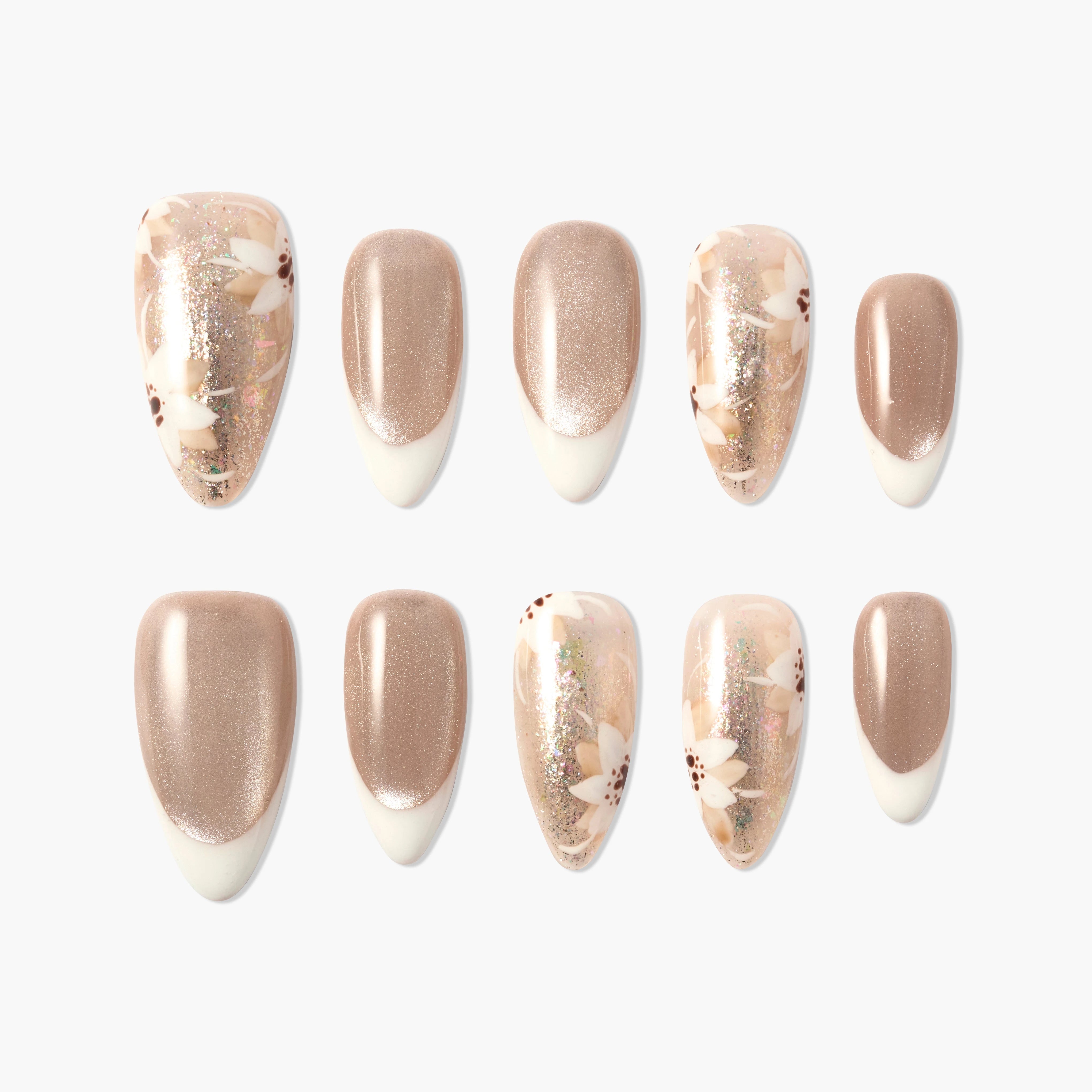 As unhas postiças artesanais Emily’s Twilight Blossom apresentam uma base nude-bege elegante realçada com gradientes de glitter fino, suaves detalhes florais brancos e clássicas pontas francesas. Um brilho subtil e camadas delicadas criam uma estética fresca e refinada. Cada peça é feita à mão para um ajuste seguro e reutilizável — perfeito para casamentos, encontros, festas ou até para uso profissional diário.