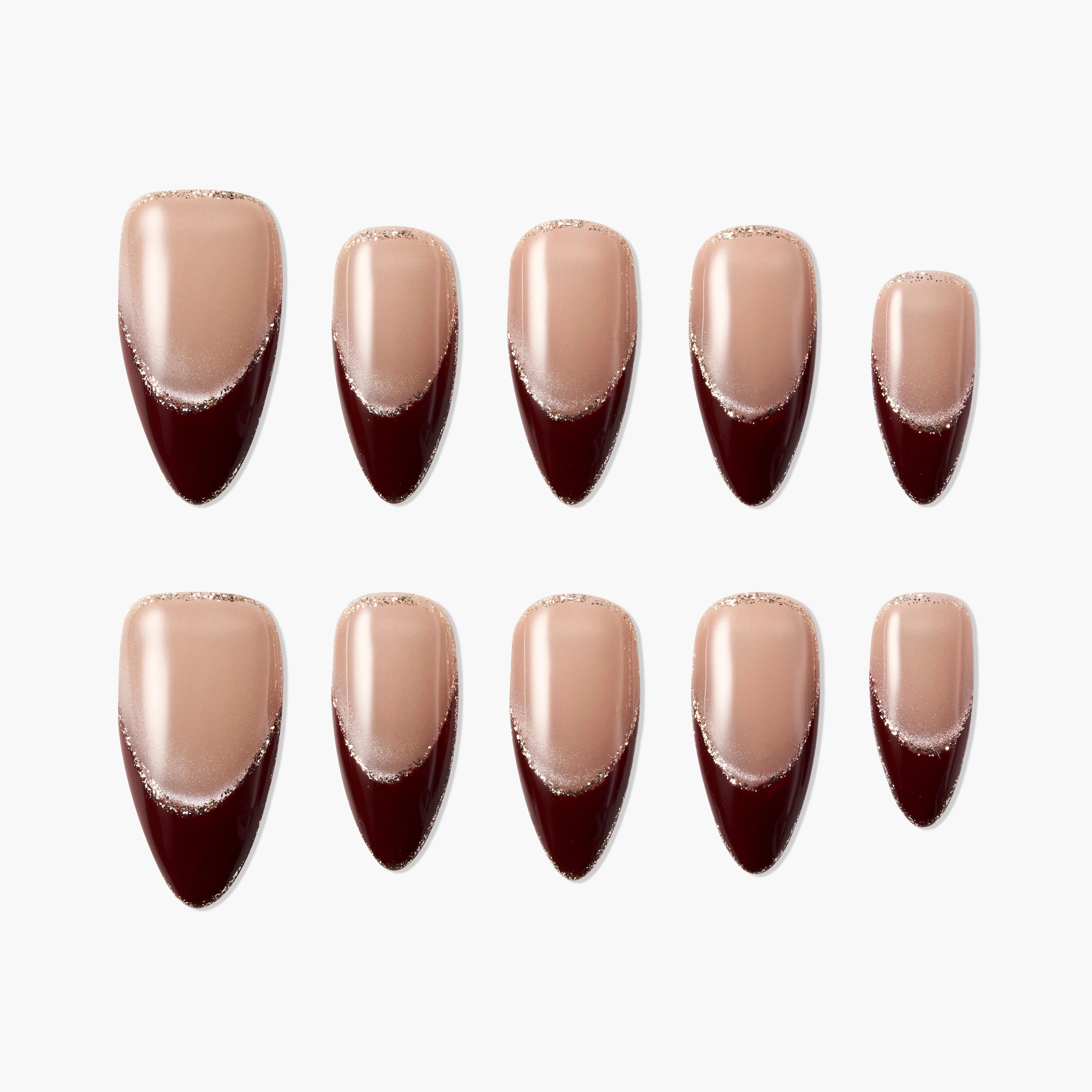 Dicas Velvet Mocha por Emily’s Nail apresentam dicas francesas em tons ricos de café com bordas de brilho subtil numa base nude—perfeitamente refinadas e modernas.