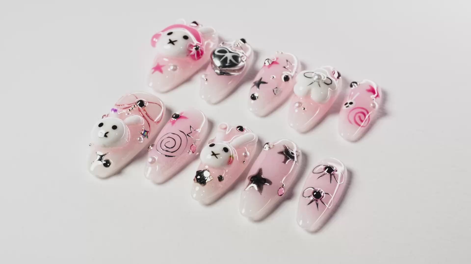 Whimsical Wonderland coleção de arte de unhas traz uma aventura de sonho cheia de coelhinhos fofos e padrões de estrelas. A base rosa suave é adornada com acessórios metálicos brilhantes, como pendentes em forma de coração, estrelas, laços e coelhinhos sorridentes, criando uma atmosfera divertida e mágica. Esta coleção é perfeita para mulheres que adoram estilos doces e vibrações de conto de fadas, oferecendo uma experiência encantadora para cada utilizadora.