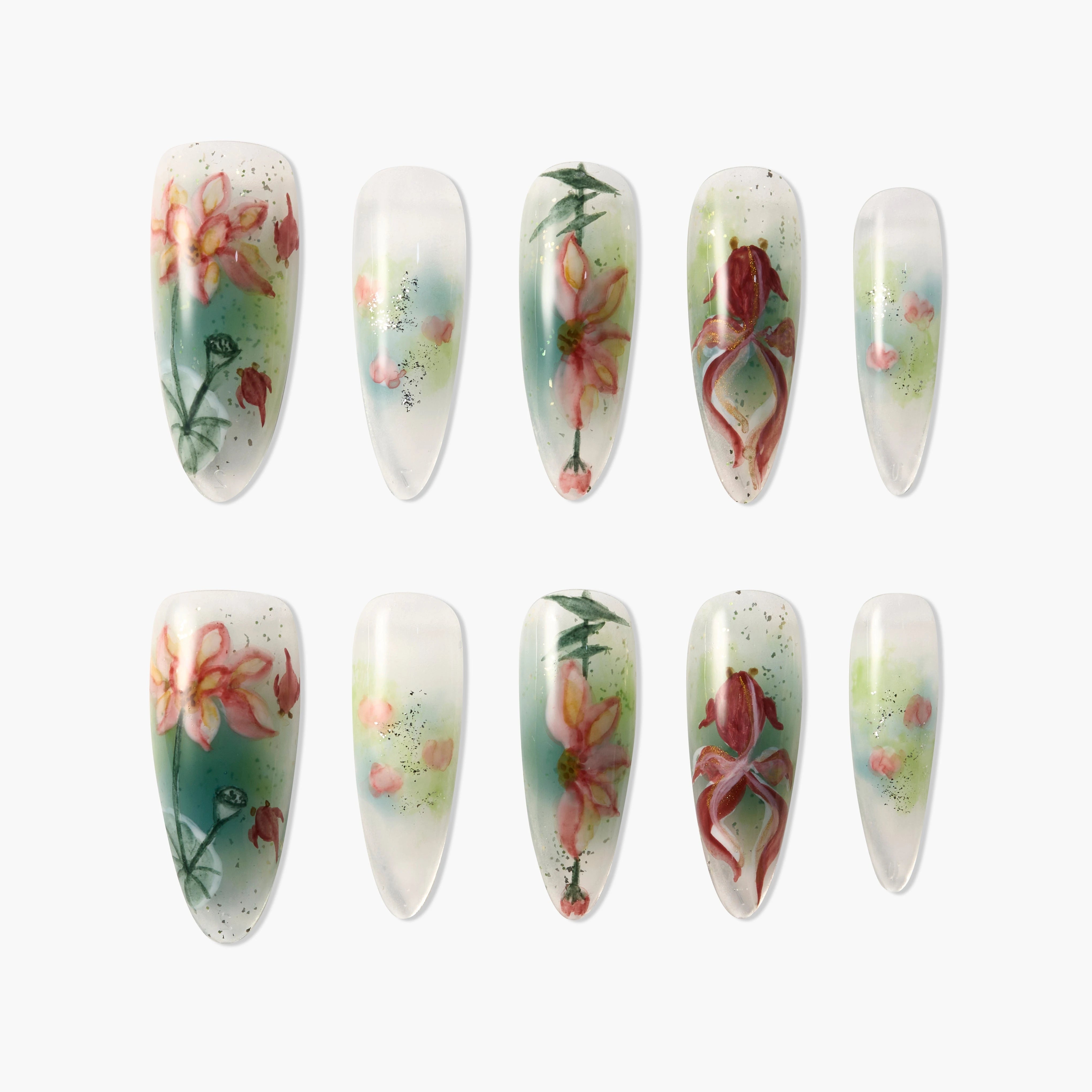 Mergulhe na poesia da aguarela com "Whispering Lotus" da Emily. Cada unha é uma pintura em miniatura — suaves lavagens de verde e rosa fluem sem esforço, desabrochando em pétalas semelhantes a lótus e pétalas a flutuar na névoa. A base translúcida capta a luz como o orvalho da manhã, tornando cada ponta dos dedos numa expressão elegante de calma e graça.