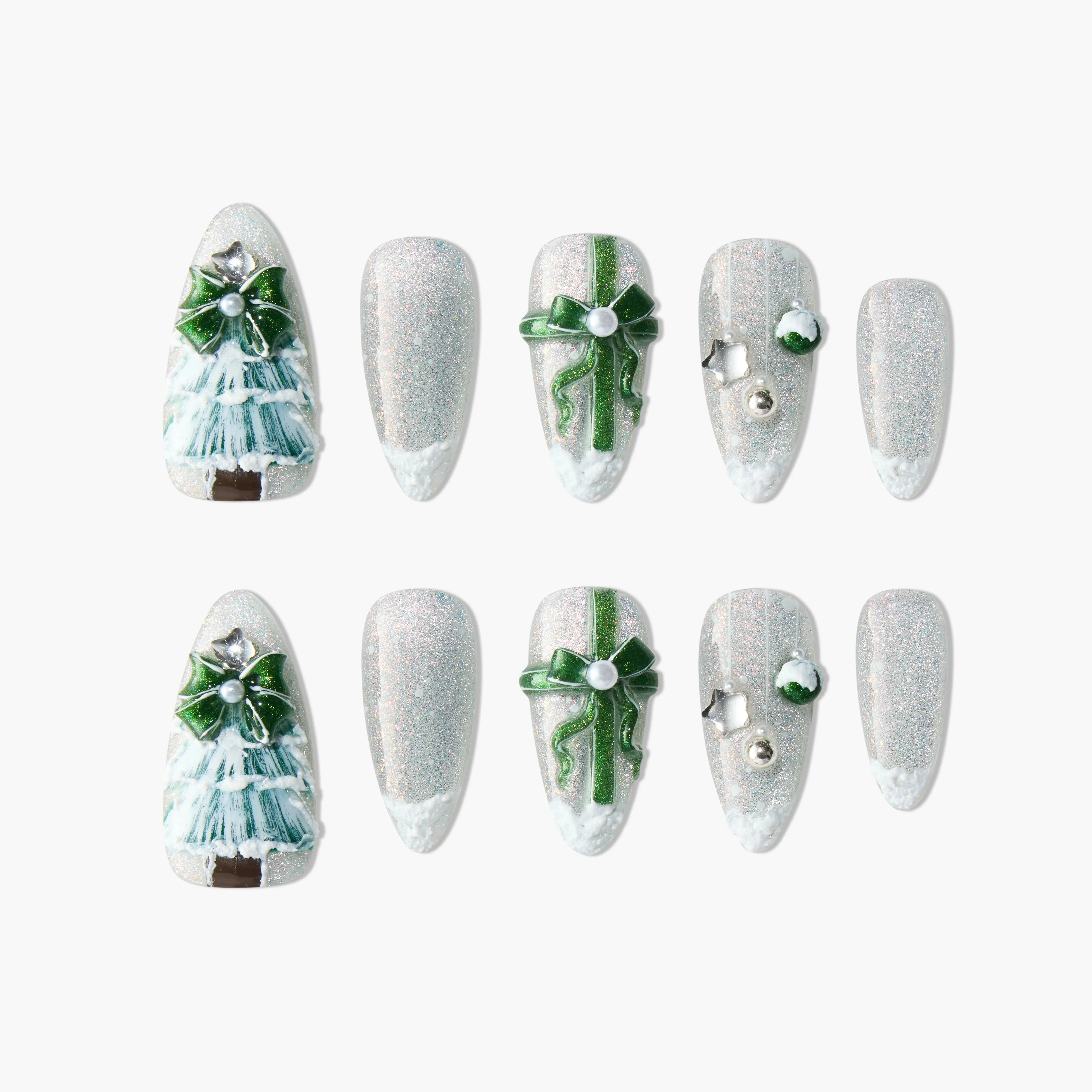 Estas fitas de unhas prateadas cintilantes apresentam desenhos detalhados de árvores de Natal com fitas verdes e detalhes de neve. O acabamento brilhante imita um país das maravilhas de inverno, completo com decorações festivas, tornando-as as unhas perfeitas para a época natalícia.